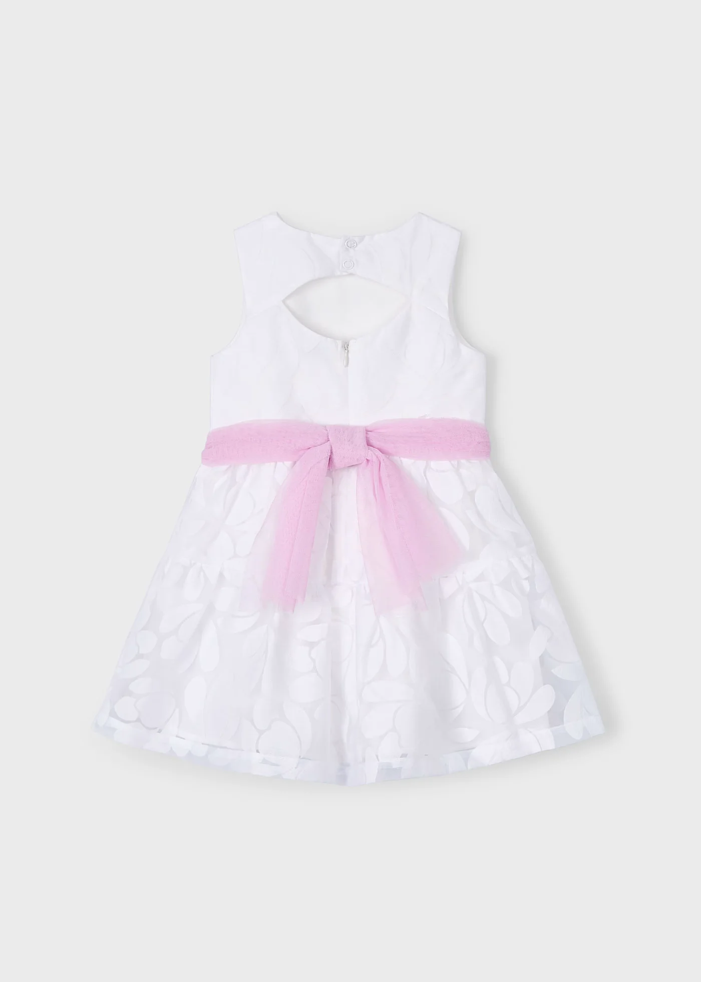 Vestito senza manica per bambina. Girocollo. Chiusura con bottoni a pressione nella parte posteriore. Apertura posteriore con cerniera invisibile. Design con apertura sulla schiena. Modello con riccio e volant. Elegante fusciacca in vita. Questo esclusivo articolo appartiene alla collezione Cerimonia ed è stato pensato per ricorrenze, eventi e occasioni speciali.