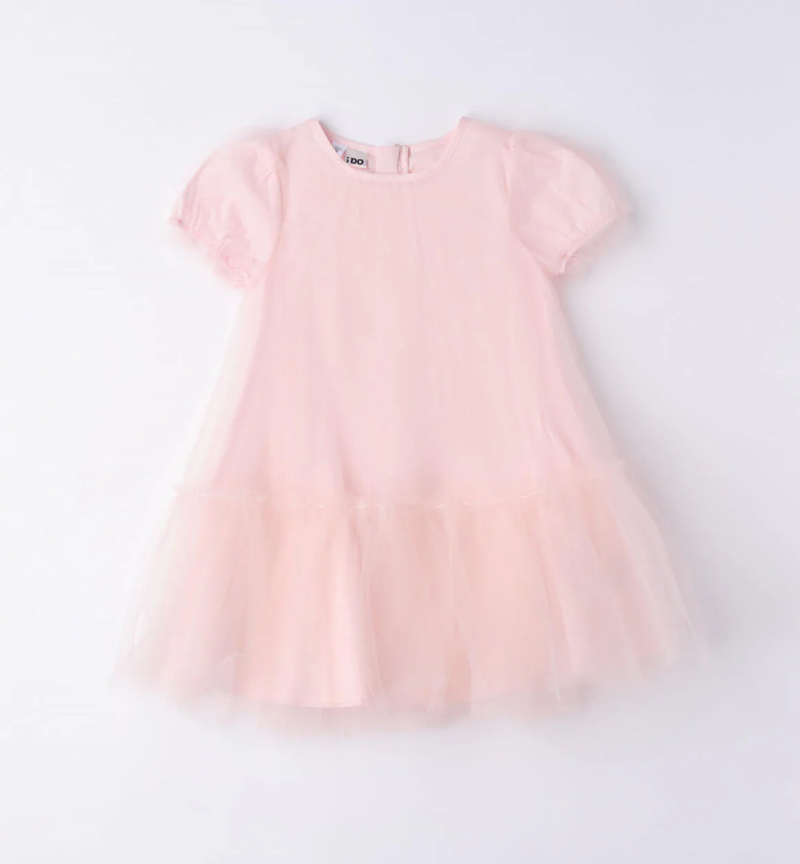 Abito iDO per bambina realizzato in tulle con fodera in cotone. Apertura dietro la schiena con zip invisibile. Lunghezza al ginocchio