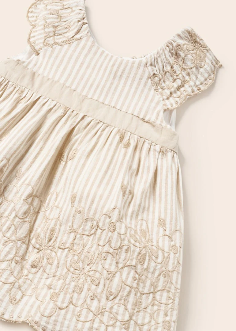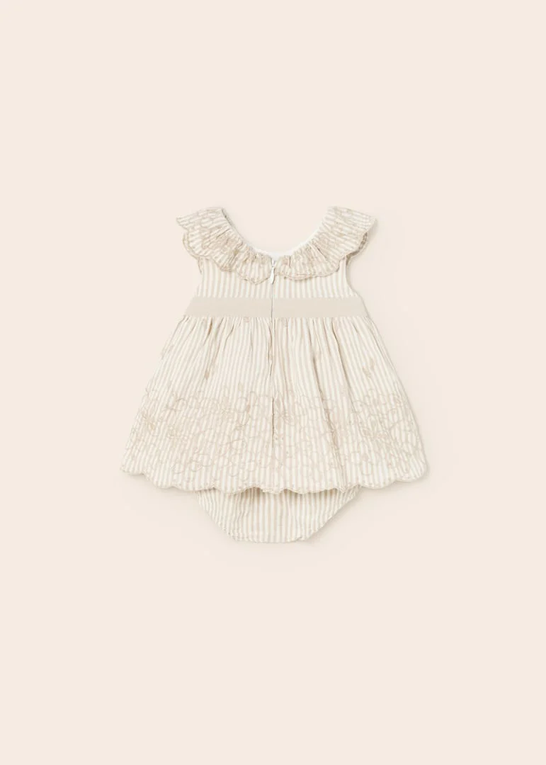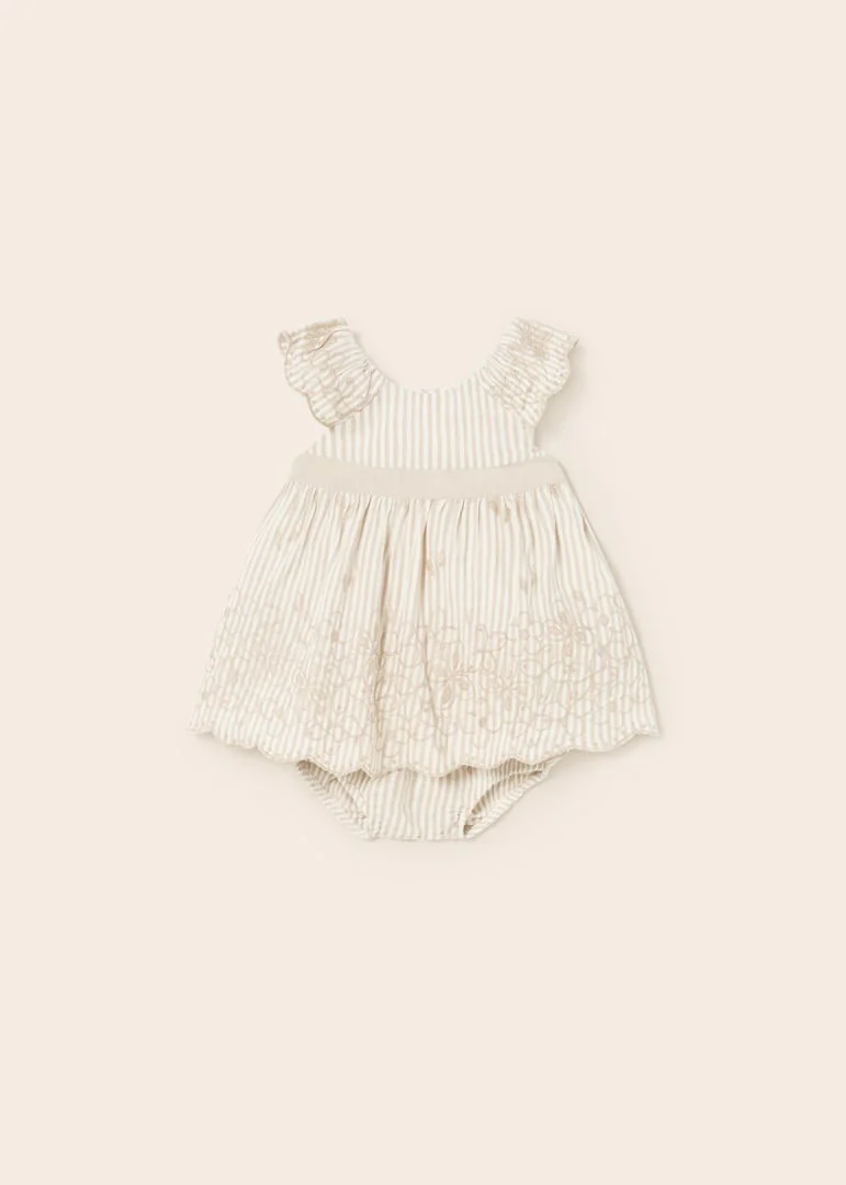 Abito da cerimonia ricamato con mutandine abbinate della collezione Mayoral Newborn, con cerniera sul retro, color lino.