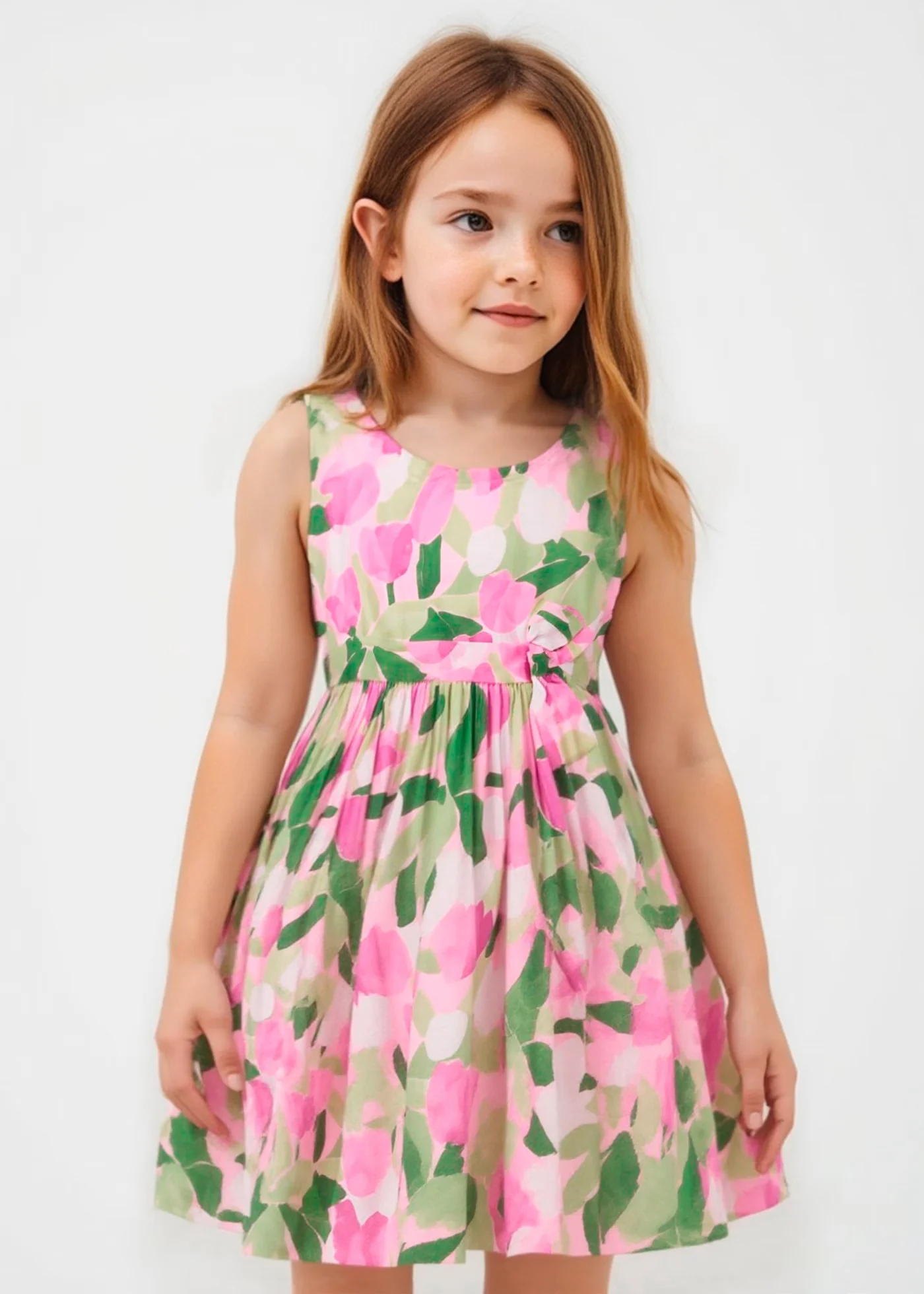 Contiene lino sostenibile europeo. Vestito senza manica per bambina. Girocollo. Apertura posteriore con cerniera invisibile. Tessuto dall’aspetto fresco e moderno di lino. Modello con fodera interna. Design con apertura sulla schiena. Elementi decorativi: fiocco. Design stampato. Questo esclusivo articolo appartiene alla collezione Cerimonia ed è stato pensato per ricorrenze, eventi e occasioni speciali.