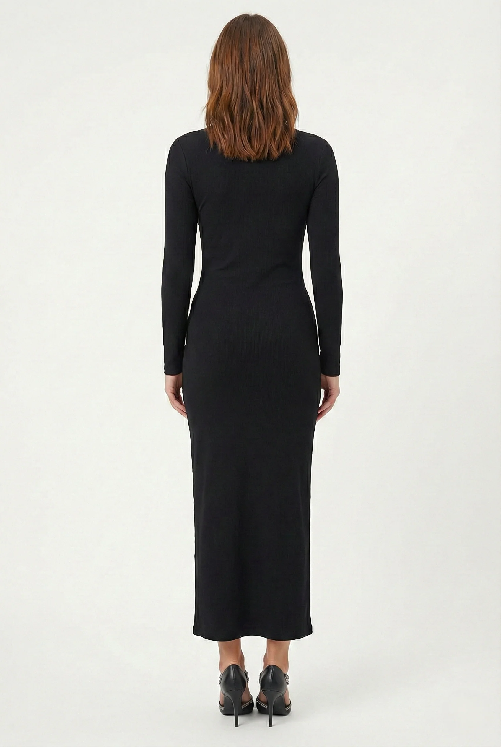 Il modello è caratterizzato da maniche lunghe e da un raffinato cut-out centrale sul décolleté e sul punto vita, impreziosito da un nodo decorativo che crea un effetto avvolgente e sofisticato. La linea aderente slancia la figura, mentre la lunghezza dona equilibrio ed eleganza.