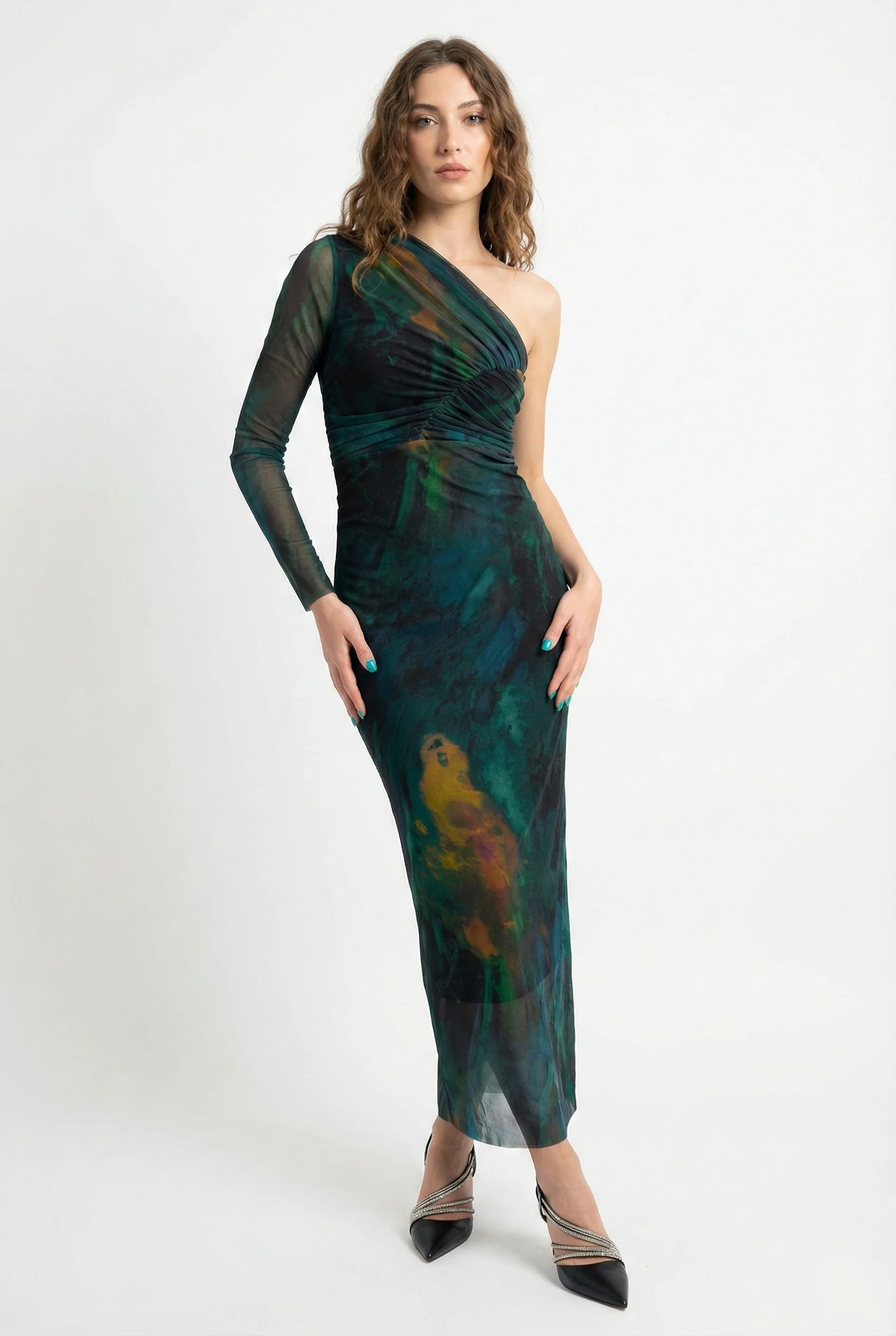Abito lungo elasticizzato monospalla con manica lunga
