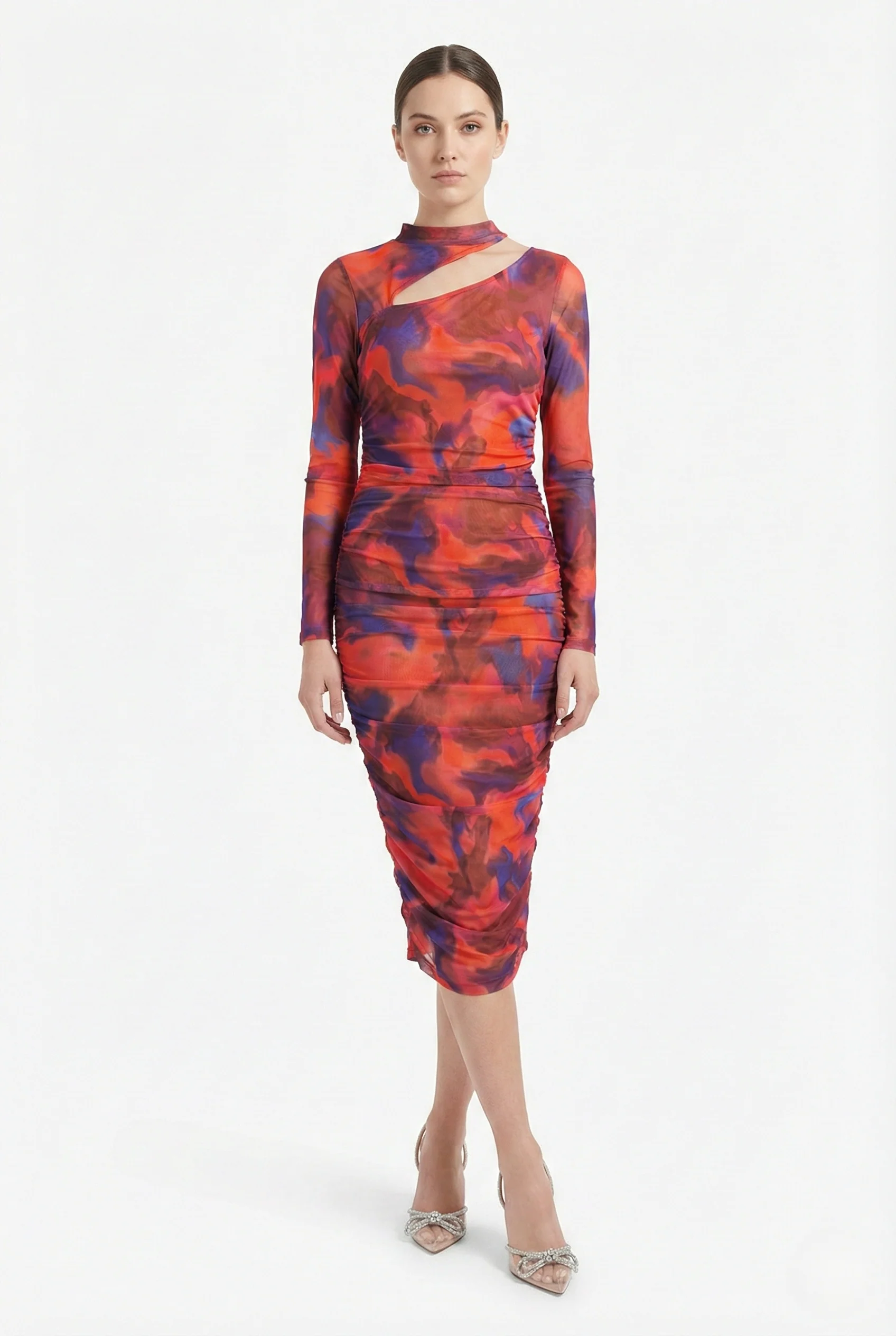 Abito midi aderente fantasia con cut-out e maniche lunghe