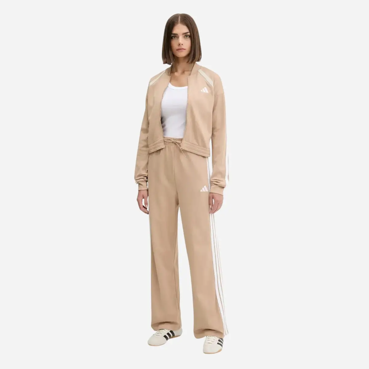 Questa tuta adidas TeamSport TS unisce linee minimal a dettagli femminili grazie al contrasto beige e bianco. La giacca dal taglio aderente incontra pantaloni a vita alta con orlo aperto, per un look rilassato e versatile, perfetto dalla colazione con le amiche alle passeggiate di tutti i giorni. Realizzata in misto cotone con una quota di materiali riciclati e rinnovabili (almeno il 70%), è una scelta comoda e più sostenibile.