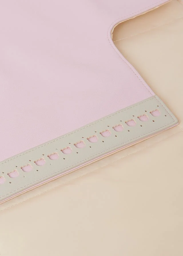 Delizioso fasciatoio rosa di Mayoral Newborn, realizzato in morbida ecopelle con finiture beige chiaro. Rosa interno beige Un materassino leggermente imbottito che si piega e si chiude con velcro, ed è foderato con un poliestere liscio come la seta.