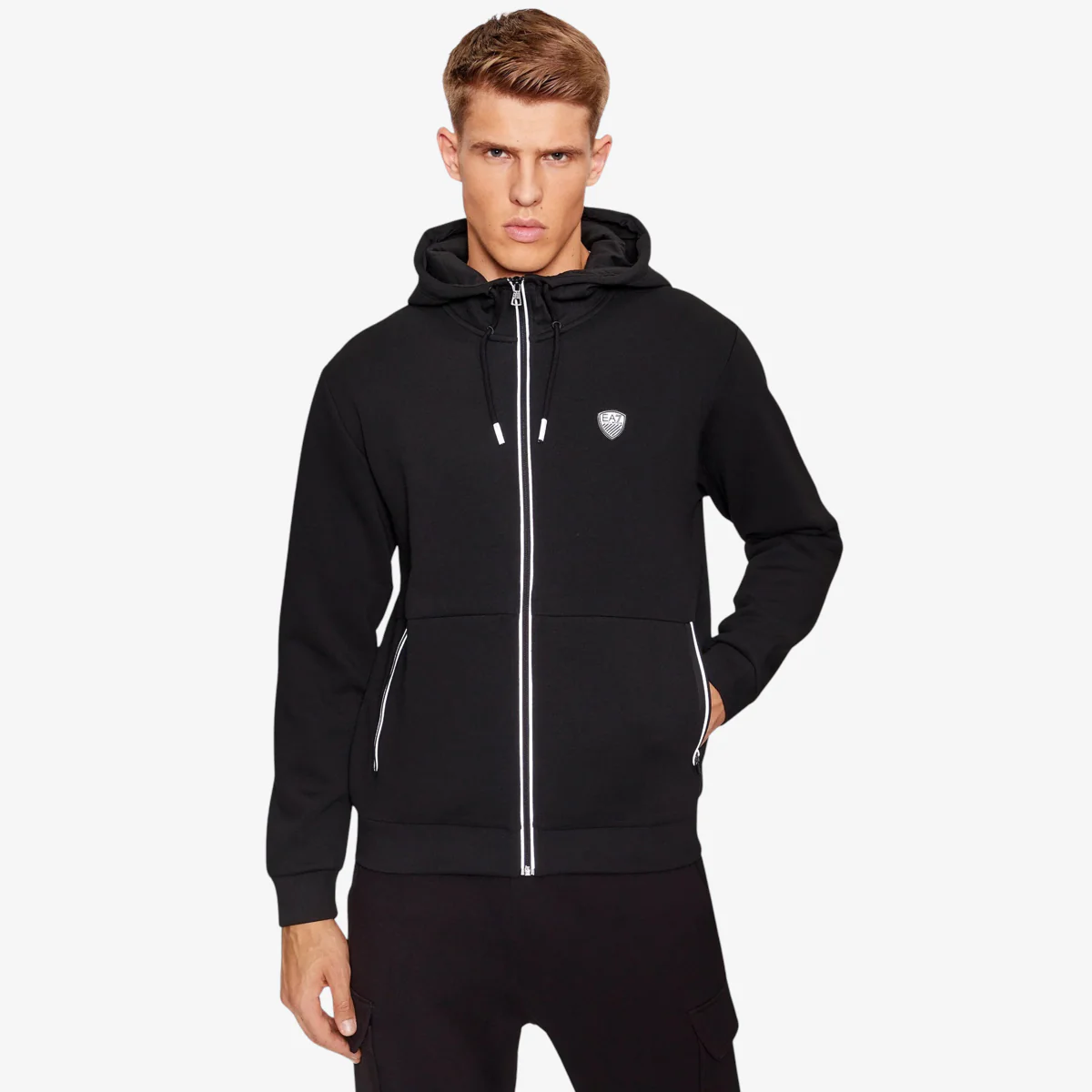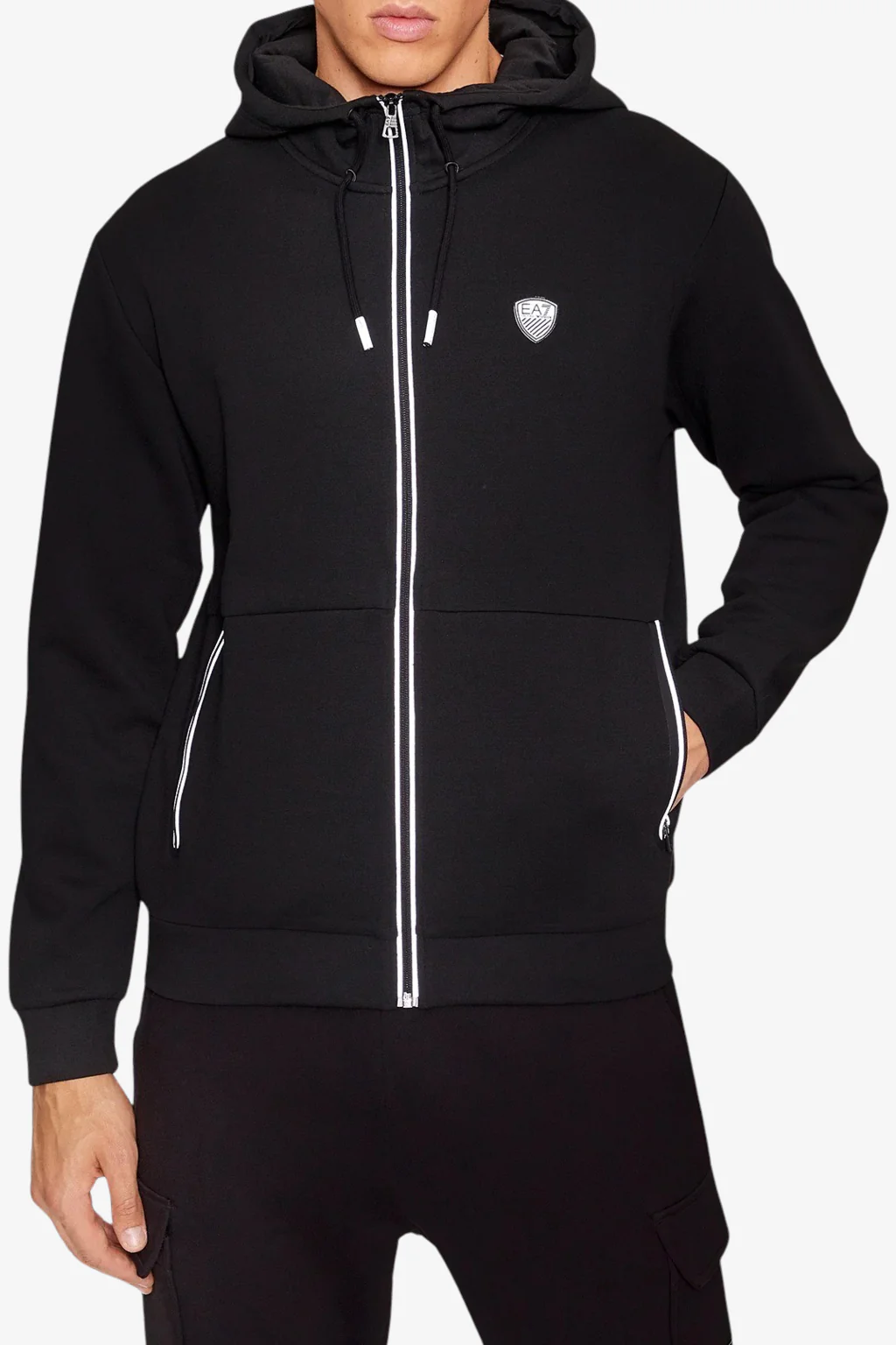 Felpa con cappuccio realizzata in misto viscosa stretch, dalla vestibilità confortevole. Il modello presenta apertura con zip, due tasche laterali zippate e una personalizzazione con patch scudetto applicato sul petto. Un capo versatile ed essenziale, complemento ideale di numerosi look in chiave sportiva.