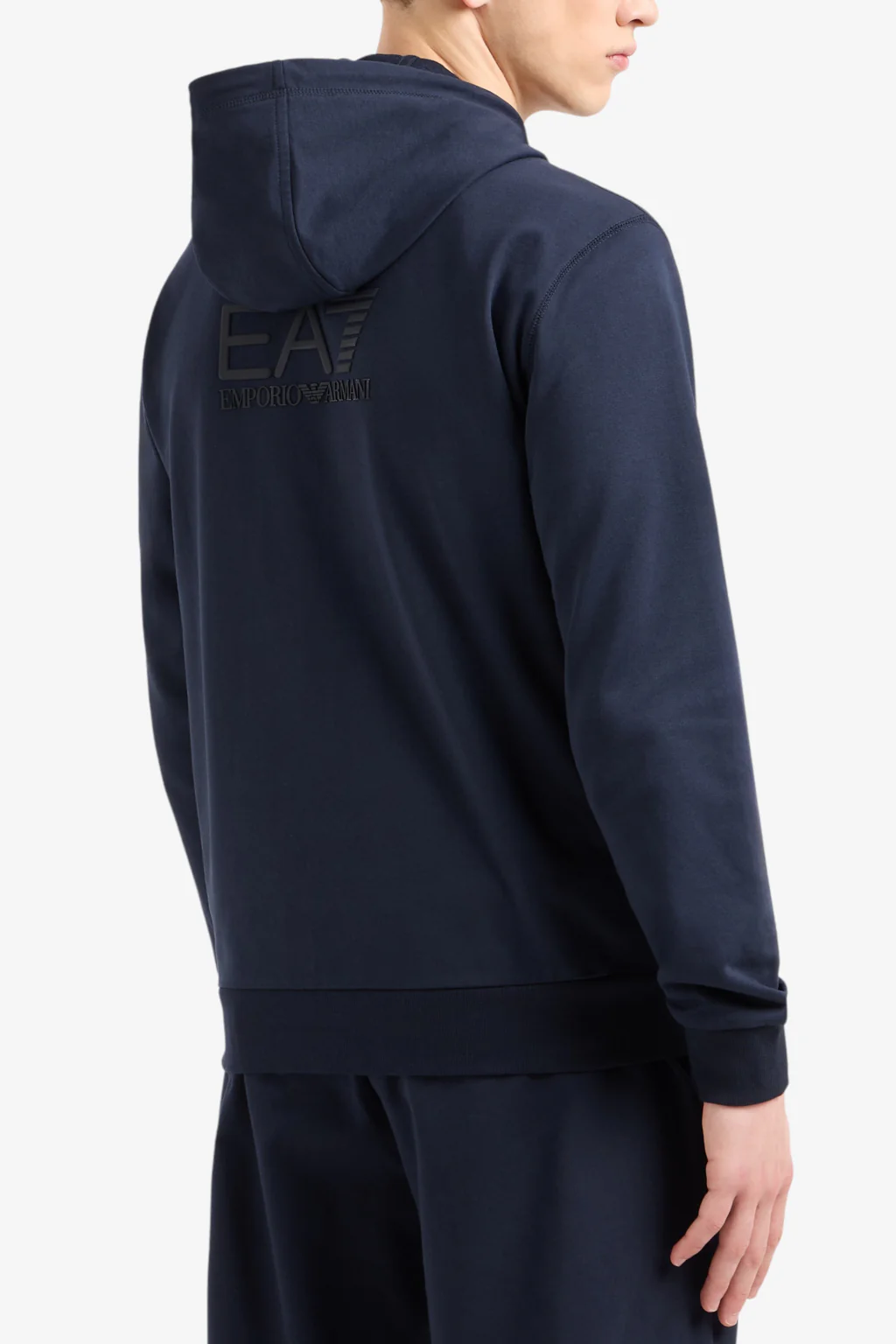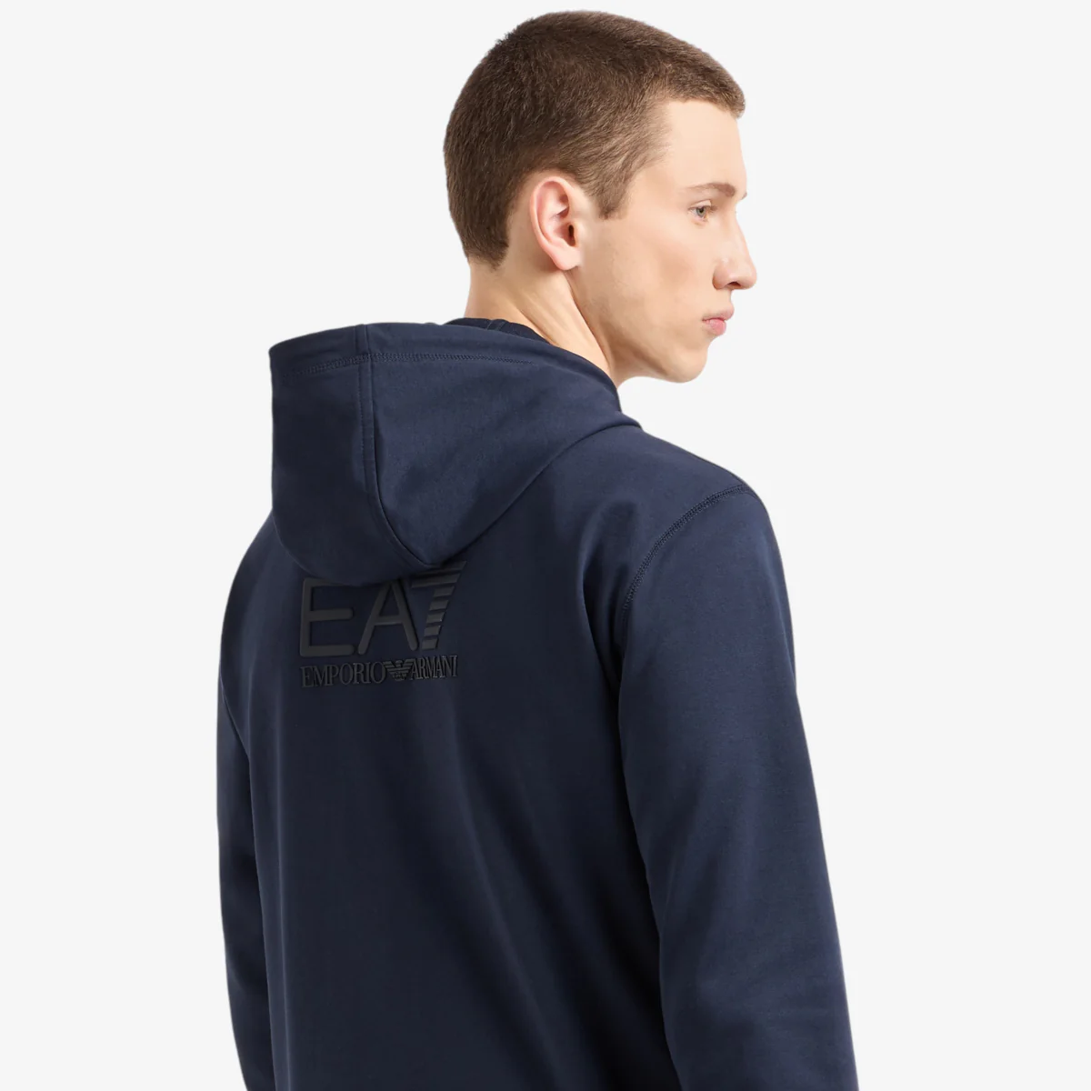 Felpa con cappuccio e zip realizzata in morbido cotone, dalla vestibilità regular. Il modello, con due tasche a marsupio, si distingue per la maxi stampa sul schiena del logo EA7 ed è parte della collezione Visibility. I capi della proposta riflettono completamente il mood ‘Go big or go home’ tipico degli slogan sportivi, grazie al logo EA7 in rilievo, che personalizza ogni modello.