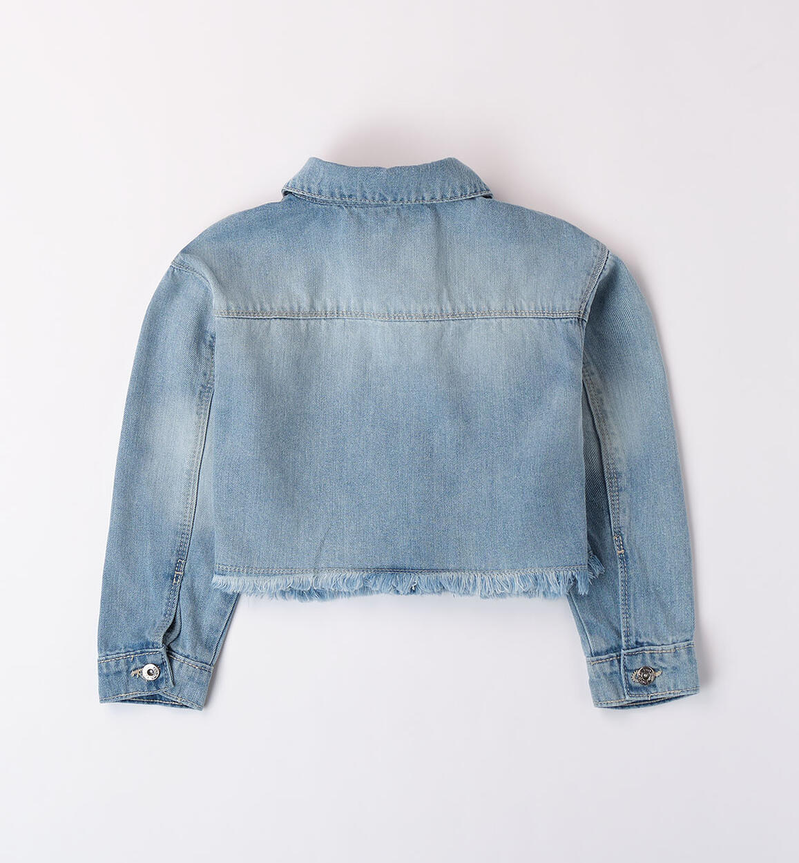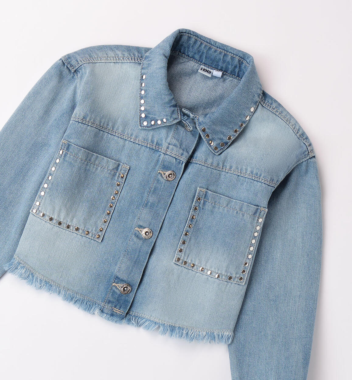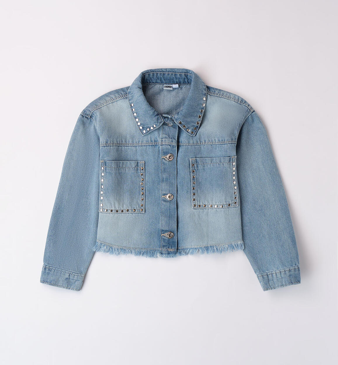 Giubbotto iDO per ragazza realizzato in denim 100% cotone, sfrangiato sul fondo, con tasche e colletto arricchiti da piccole borchie.