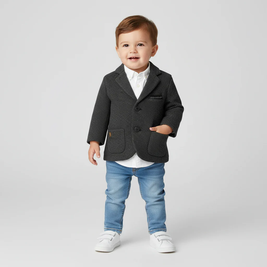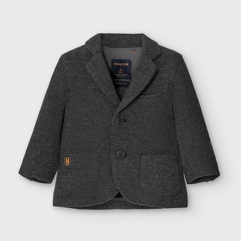 Una splendida giacca elegante per neonato, ideale per le occasioni speciali, dal design liscio e con tasche funzionali nella parte anteriore ad impreziosire il look.