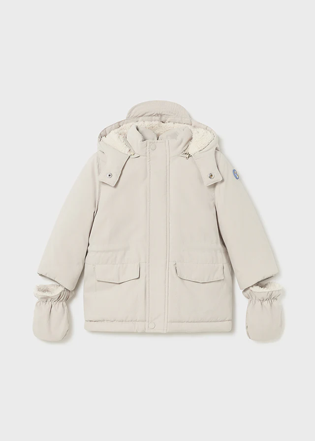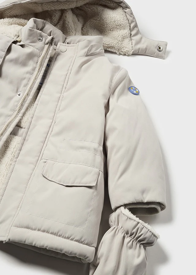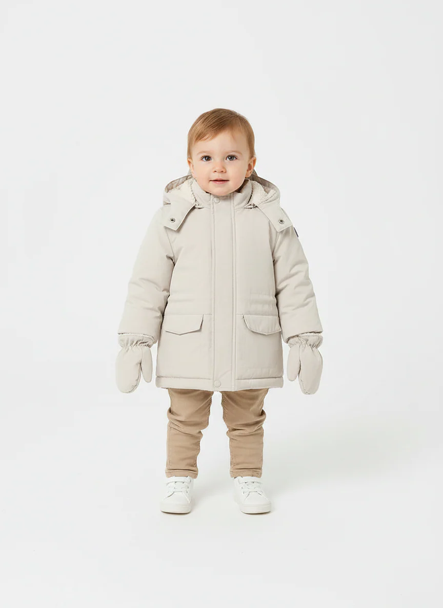 Giaccone manica lunga per neonato con polsini elasticizzati. Colletto avvolgente. Colletto con cappuccio rimovibile. Chiusura con bottoni nella parte anteriore. Chiusura centrale con cerniera. Cintura con cordoncino interno regolabile. Design con manopole rimovibili. Tasche funzionali nella parte anteriore.
