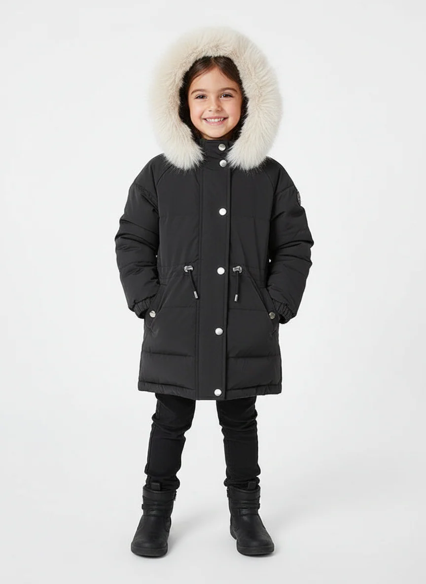 Giaccone manica lunga per bambina con polsini elasticizzati. Cappuccio fisso con pellicciotto rimovibile. Chiusura con cerniera frontale e bottoni a pressione. Leggero tessuto traspirabile e dalla grande comodità. Calda imbottitura interna. Tasche funzionali nella parte anteriore. Leggera variazione del design nelle taglie 2 e 3 per motivi di sucurezza