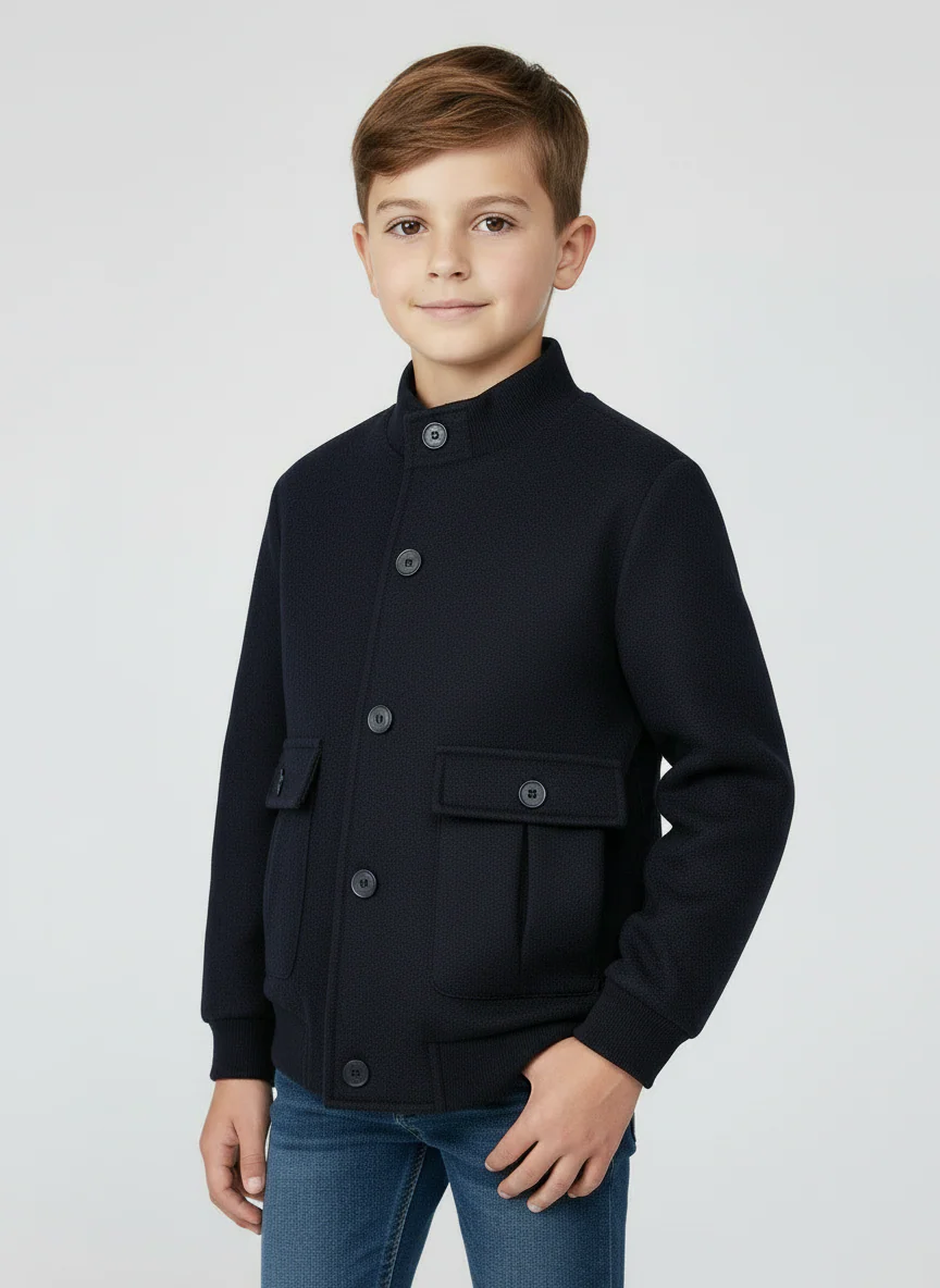 Giubbotto manica lunga per bambino. Chiusura con bottoni nella parte anteriore. Caldo tessuto di panno resistente e classico. orlo, polsini e colletto con elastico per una migliore vestibilità. Tasche funzionali nella parte anteriore.