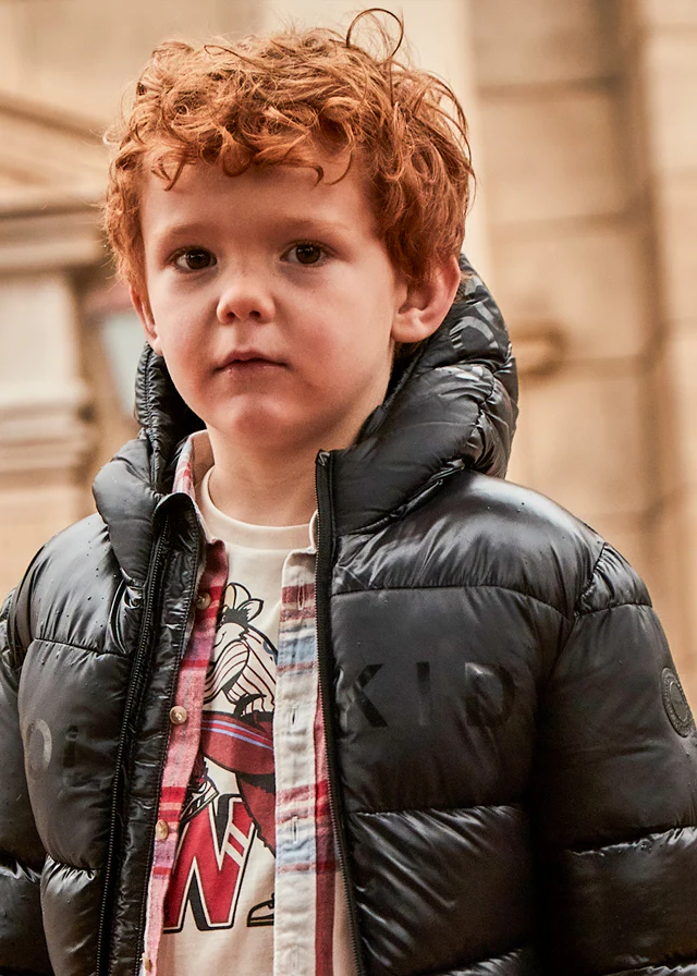 Giaccone manica lunga per bambino con polsini elasticizzati. Colletto con cappuccio. Chiusura centrale con cerniera. Orlo elasticizzato per una migliore vestibilità. Tasche funzionali nella parte anteriore.