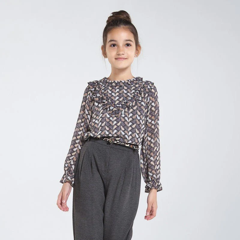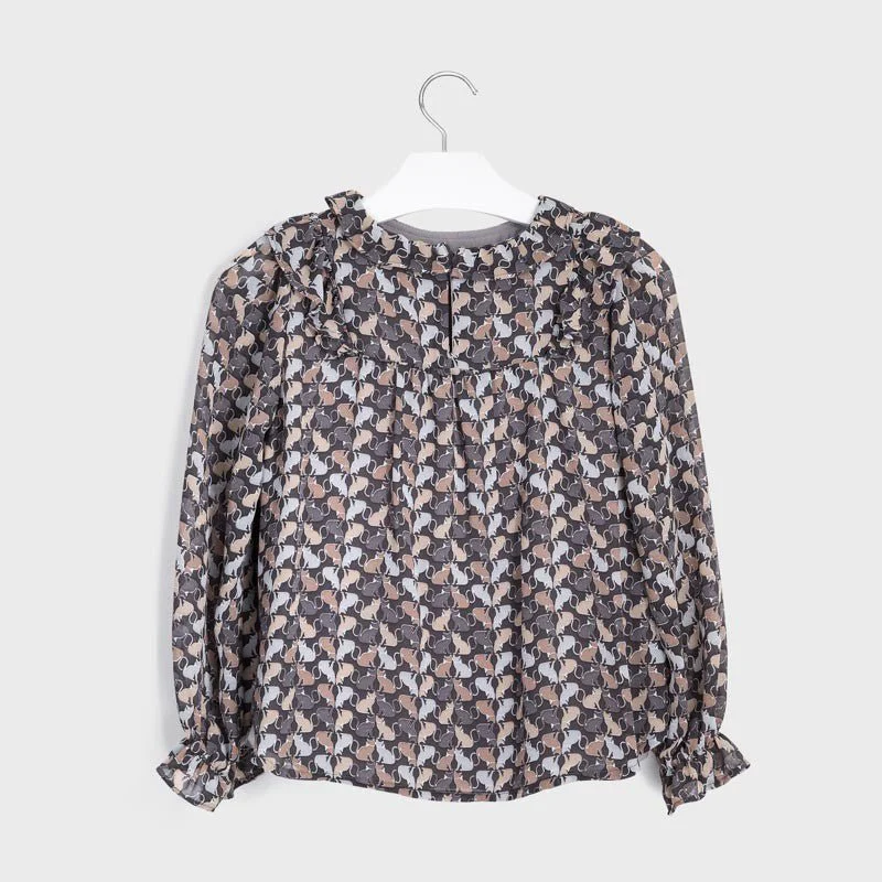 Elegante blusa in garza per bambina con fantasia gattini a balze