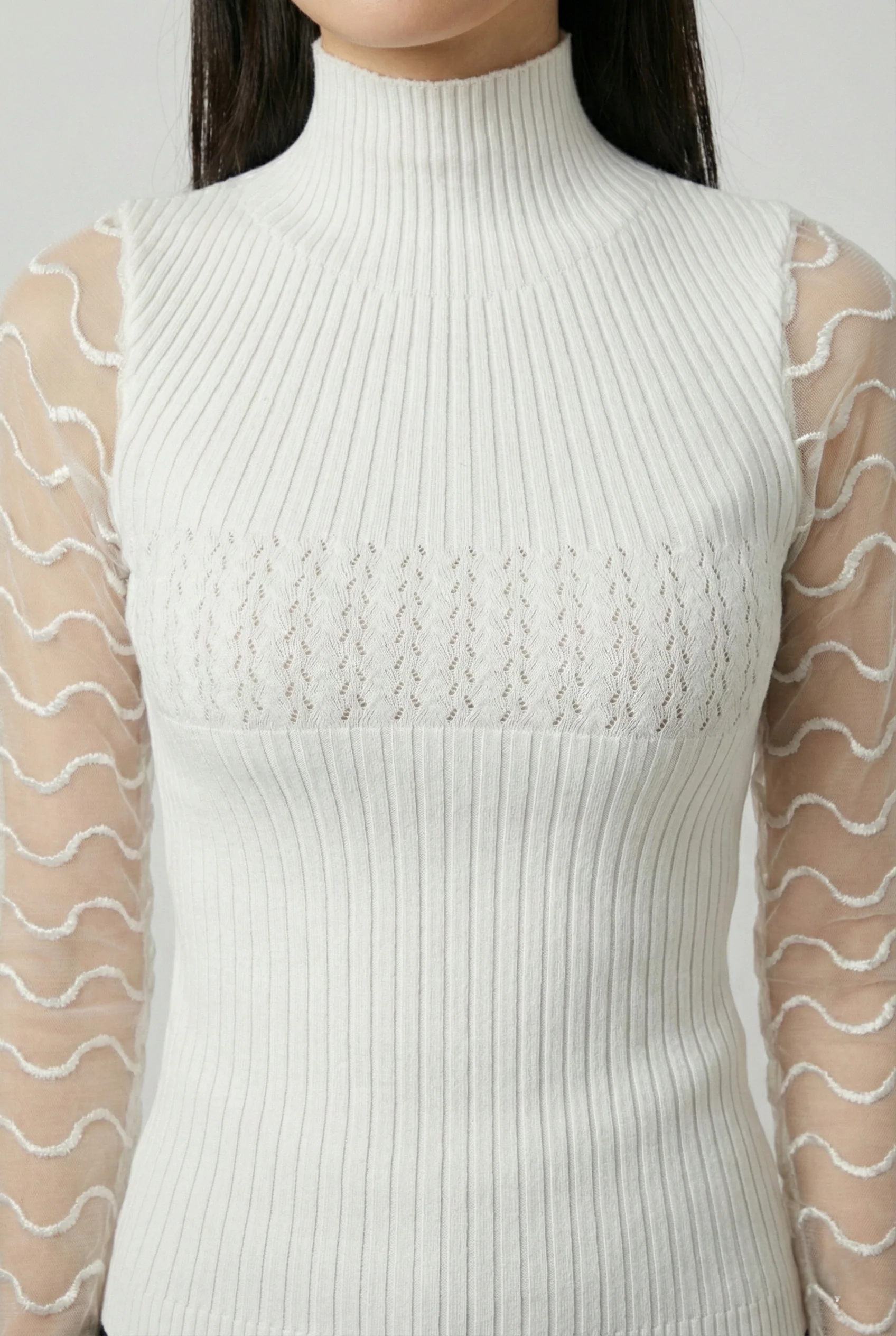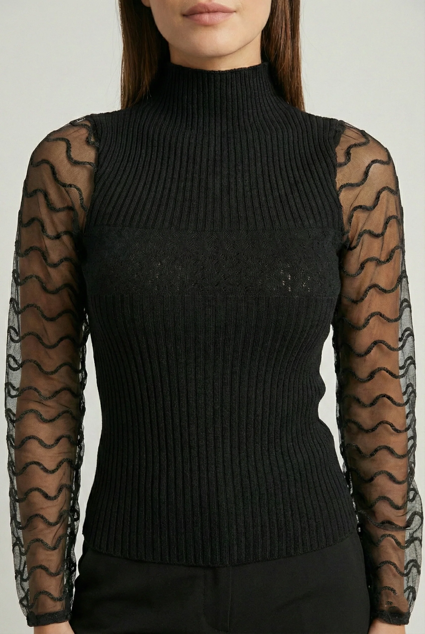 Il design si distingue per il collo alto elegante e per le maniche trasparenti in tulle con ricami ondulati, che donano un tocco sofisticato e sensuale senza risultare eccessivo. Perfetta sia per outfit da giorno che per look serali, si abbina facilmente a pantaloni sartoriali, gonne o jeans.