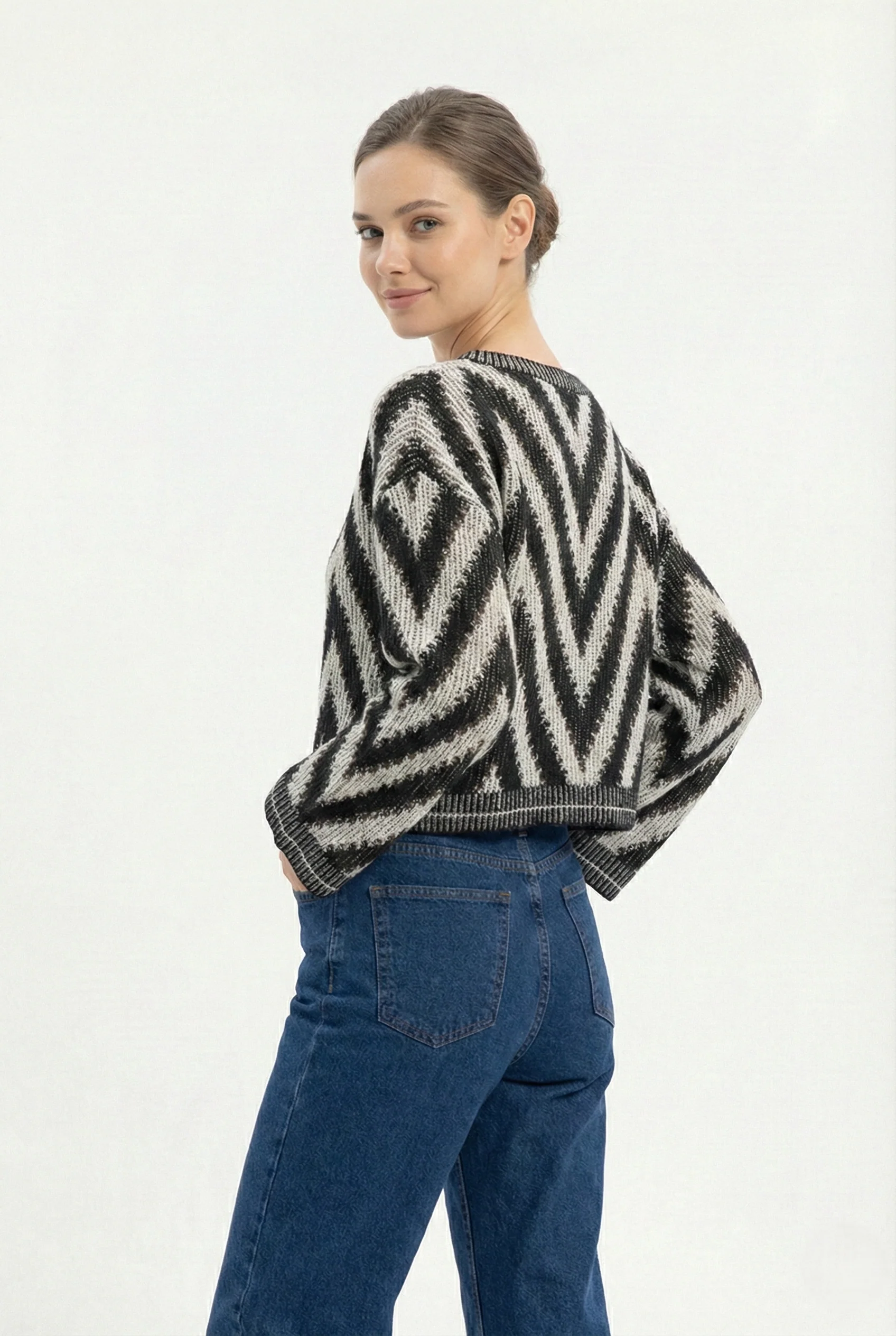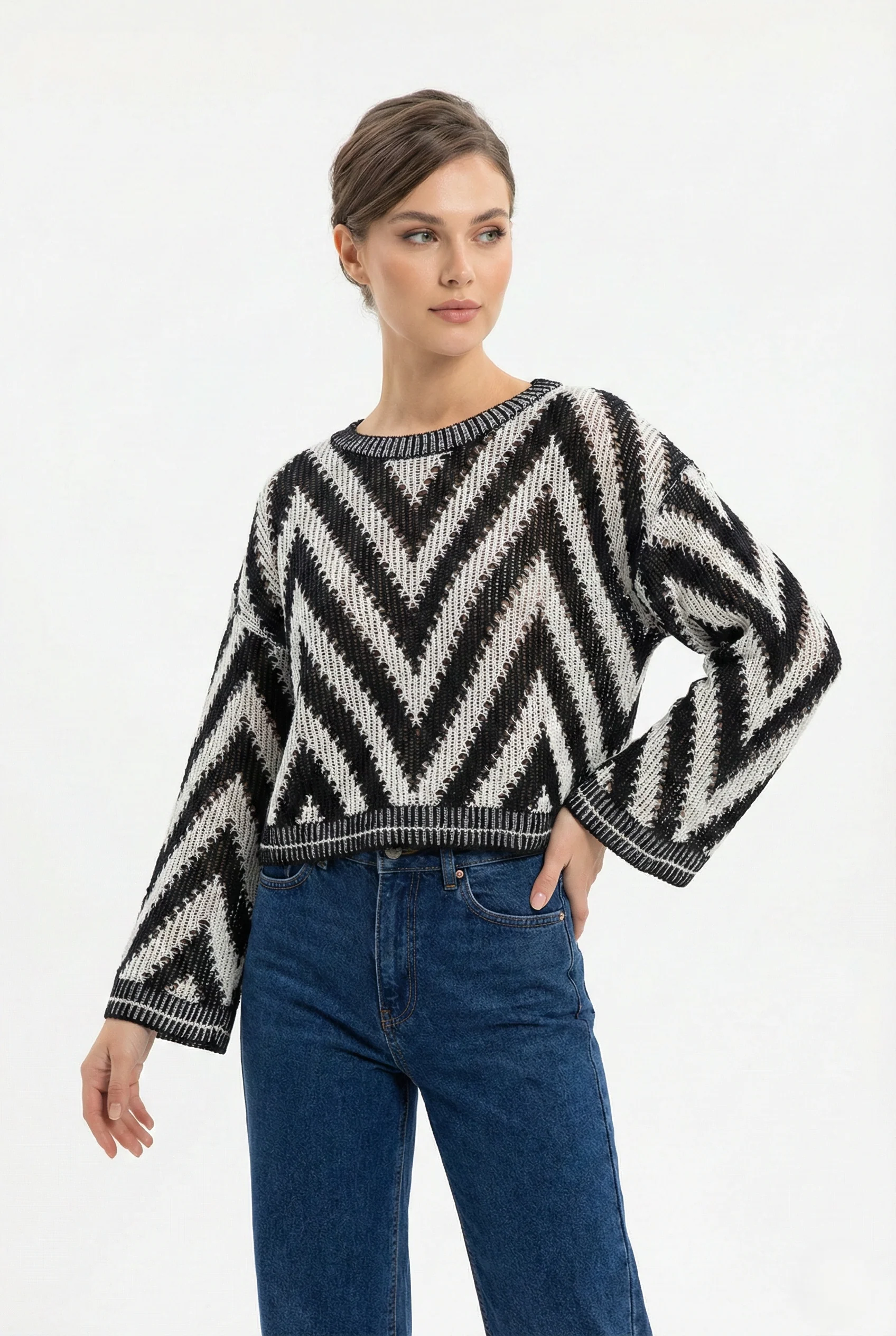 Questo maglioncino traforato da donna è il capo perfetto per chi cerca uno stile moderno, elegante e facile da abbinare. Caratterizzato da un raffinato motivo a zig zag bicolor nero e bianco, dona personalità all’outfit senza rinunciare alla versatilità.