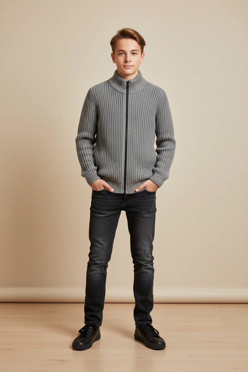 Maglioncino ragazzo in tricot in maglia manica lunga con polsini elasticizzati. Collo modello dolcevita. Chiusura centrale con cerniera zip . Tessuto caldo e morbido. Composizione: 85% acrilica 15% lana Stagione: Autunno/Inverno