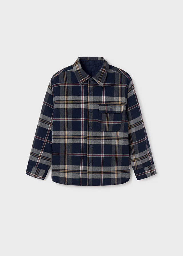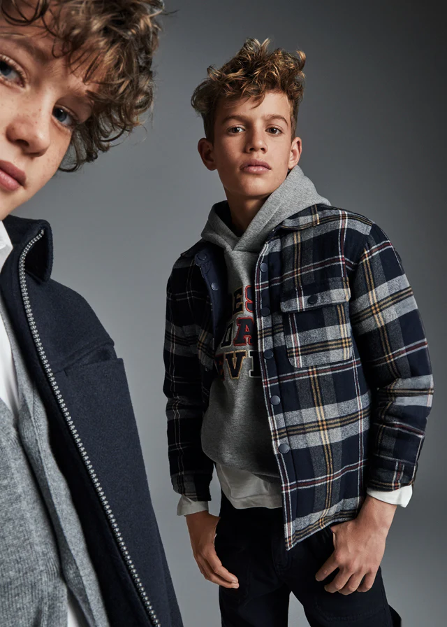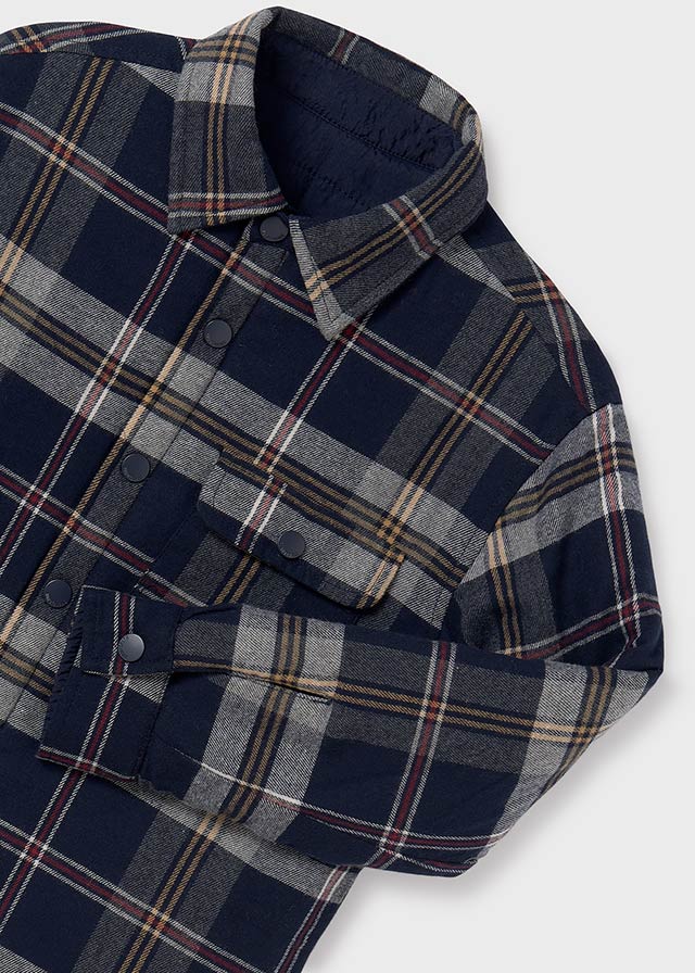 Overshirt manica lunga per ragazzo con polsini con bottoni. Colletto modello camicia. Tasche funzionali nella parte anteriore. Modello con design reversibile.