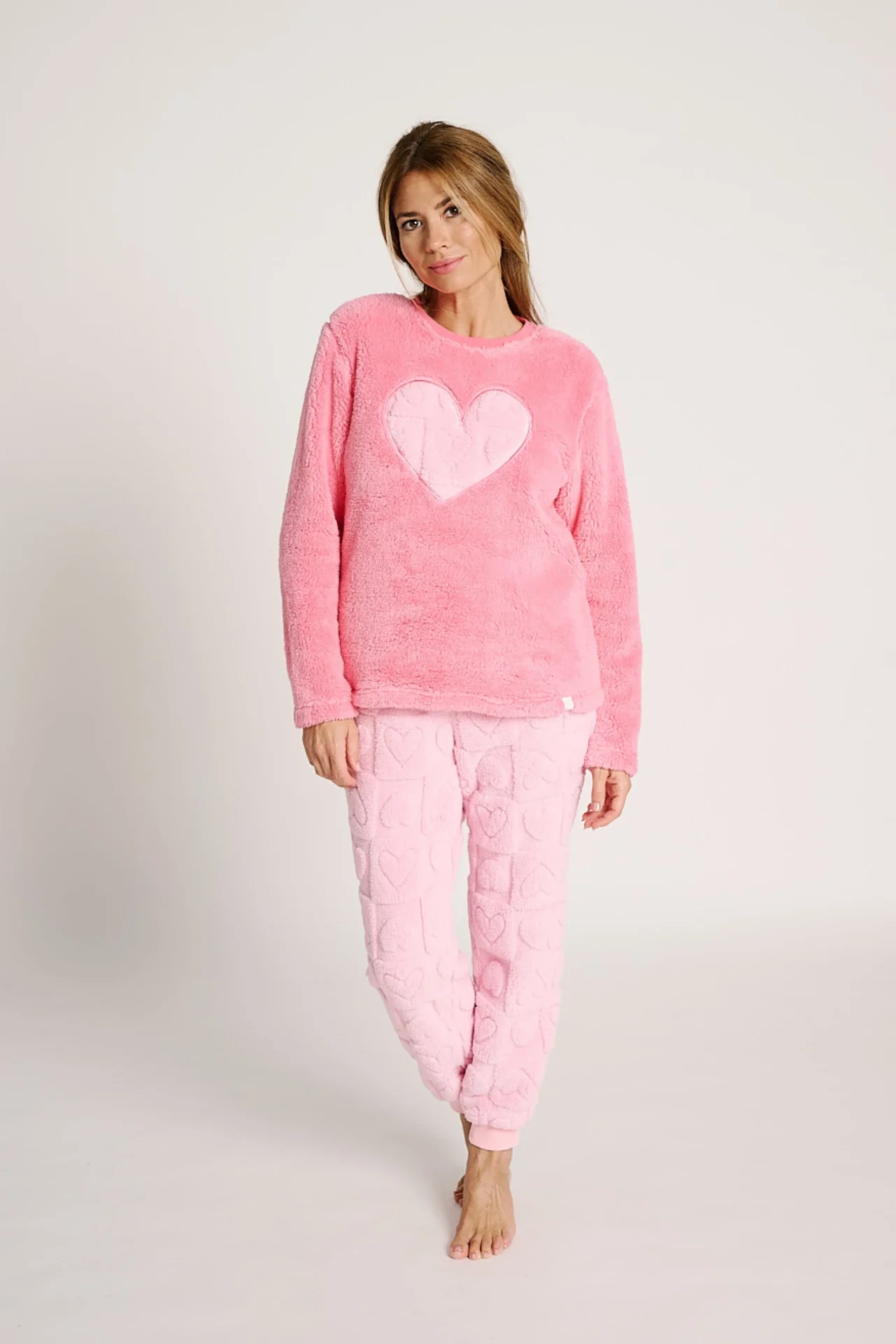 Pigiama in morbido pile con cuore raffigurato. Pantaloni con tasche e coulisse.