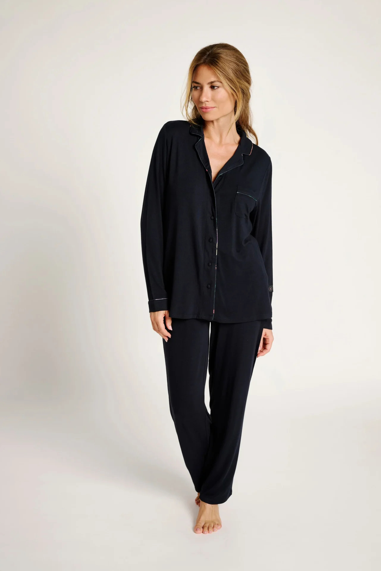 Pigiama in modal aperto davanti, colore blu scuro con contorni floreali. Pantalone con tasche e coulisse