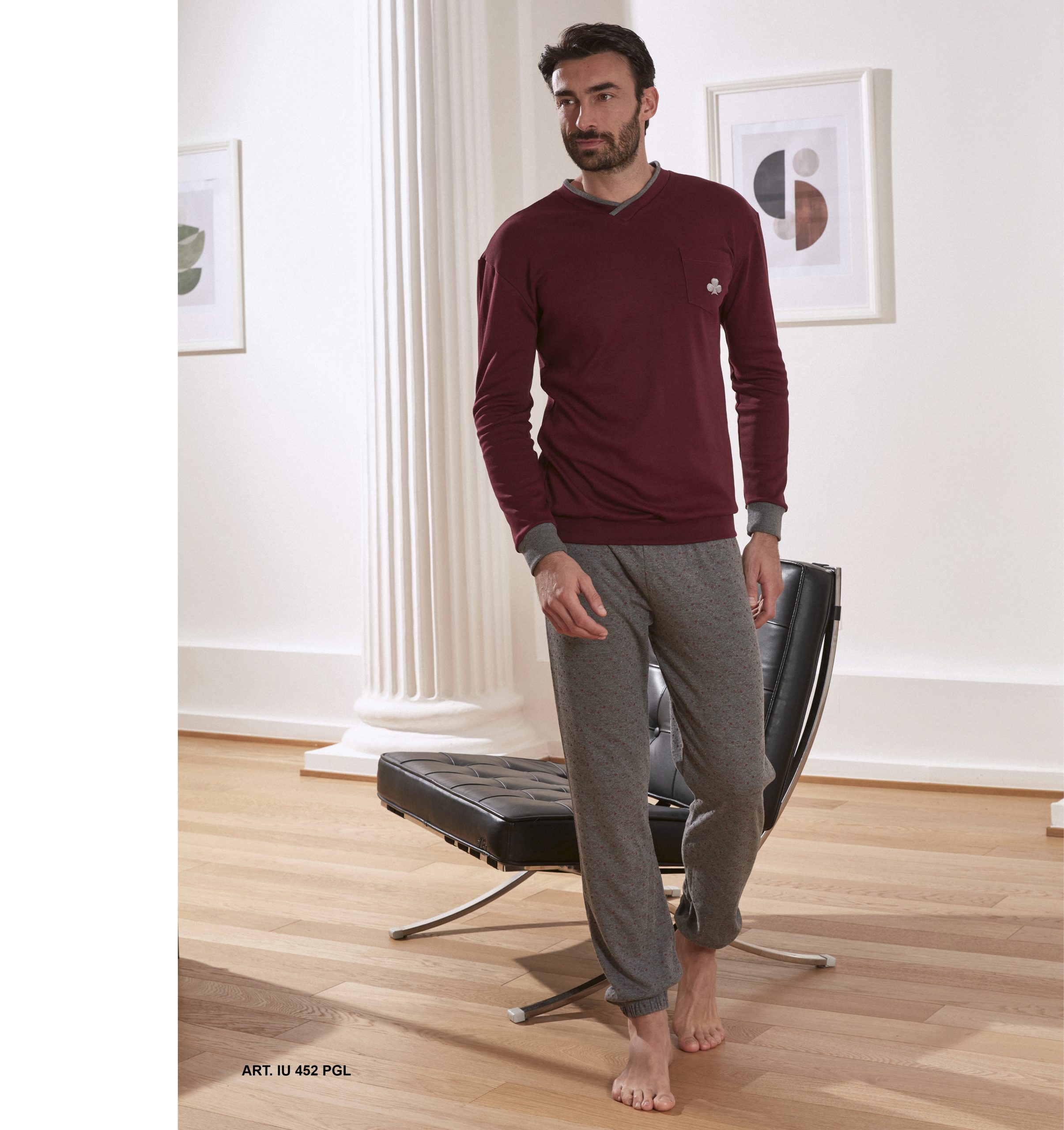 Pigiama da uomo realizzato in morbido interlock, caldo e piacevole sulla pelle, ideale per la stagione autunno-inverno. La maglia presenta uno scollo a punta con bordo sovrapposto in colore a contrasto, che dona un tocco sportivo e raffinato al tempo stesso. Sul petto è applicato un taschino con un ricamo a seme di fiori, un dettaglio originale e distintivo.
