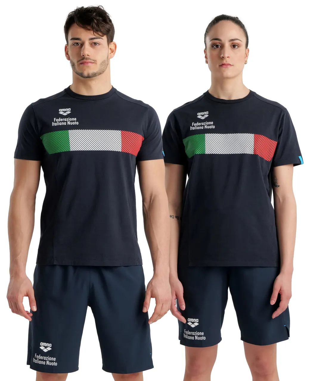 Le maglie ufficiali sono un must delle uniformi delle nazionali. Progettata per la Federazione Italiana Nuota, la T-shirt FIN a pannelli è confezionata in misto cotone leggero. Questo capo è decorato sul petto con i colori della bandiera italiana e il logo arena e della FIN. Il retro è impreziosito con la scritta con contorno in oro “Italia”.