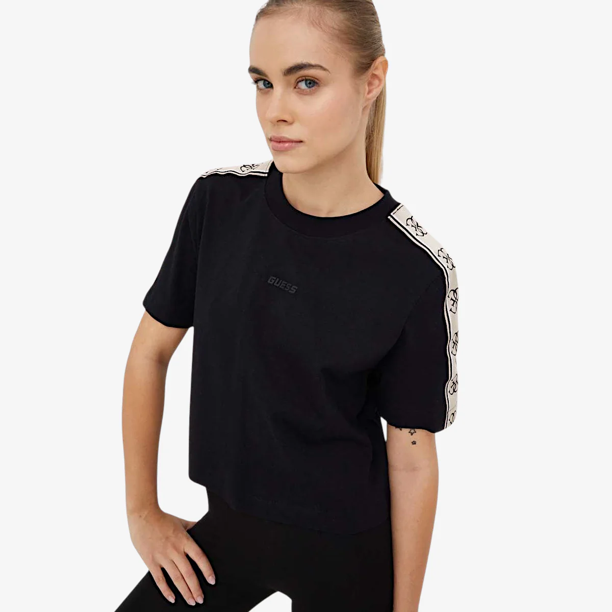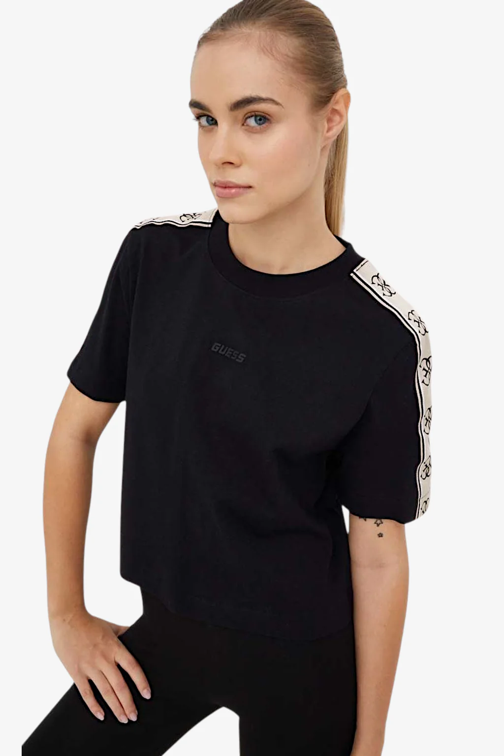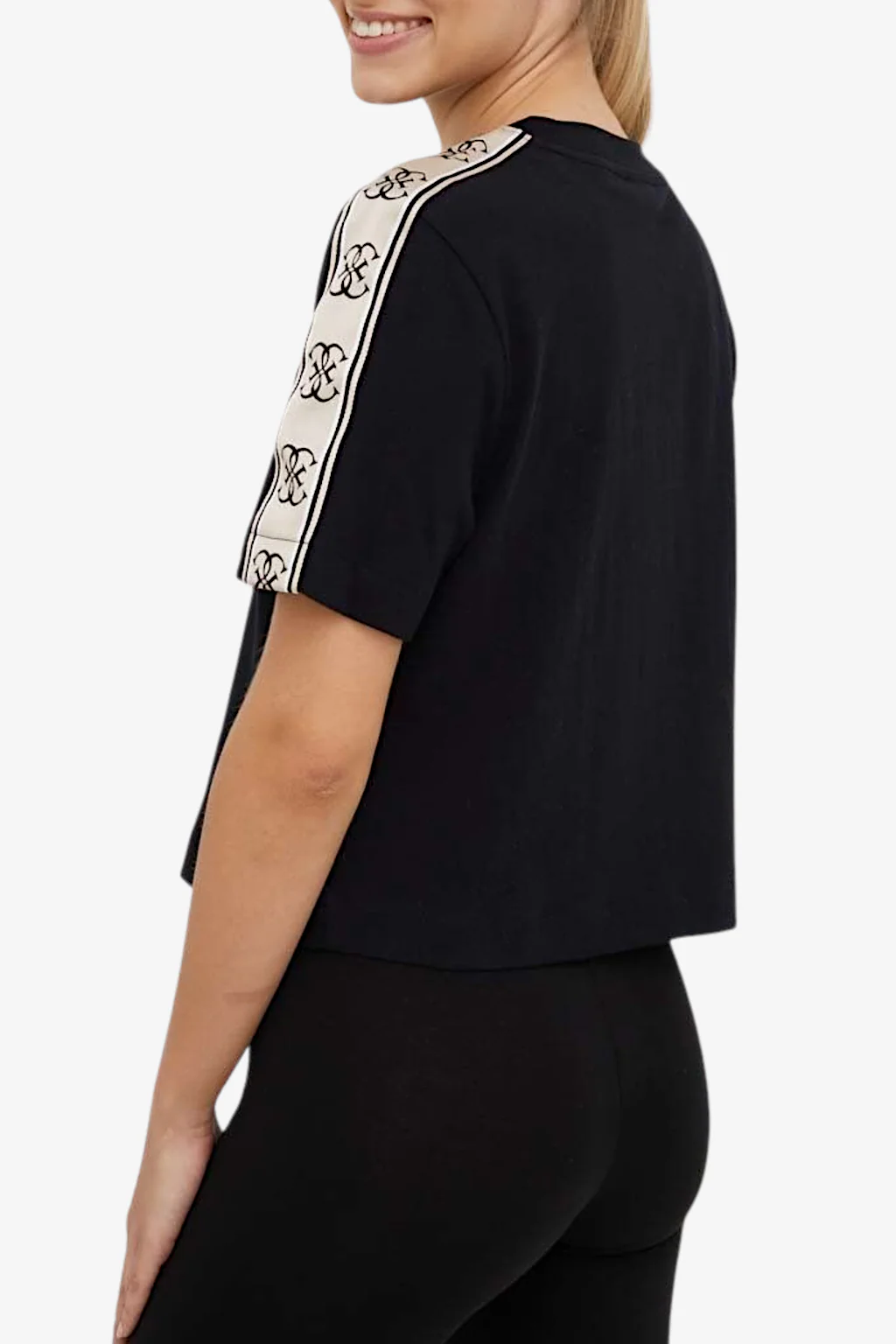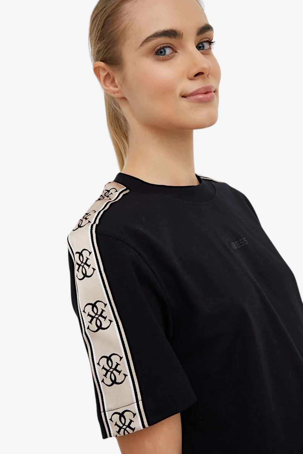 T-shirt Guess da donna Caratteristiche della t-shirt: Girocollo Vestibilità relaxed Taglio corto Bande logo lungo le maniche Logo Guess gommato applicato sul fronte della t-shirt