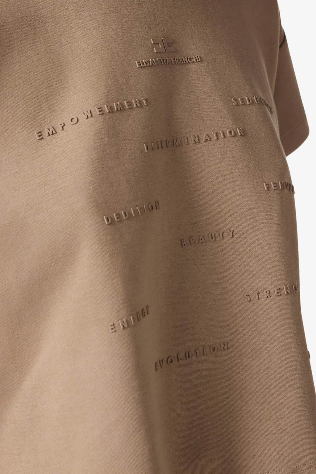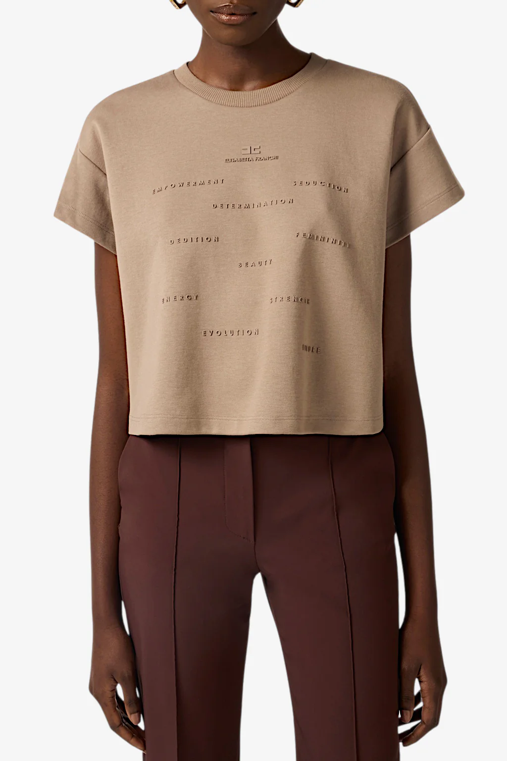 T-shirt Elisabetta Franchi da donna Caratteristiche della t-shirt: T-shirt a maniche corte ad aletta in jersey pesante e con girocollo. È personalizzata sul davanti con logo e lettering stampati in gomma a rilievo, in tono e con effetto 3D per dei dettagli tattili. Vestibilità regular