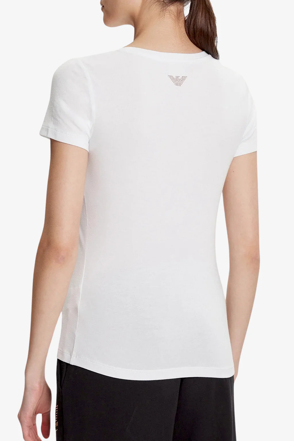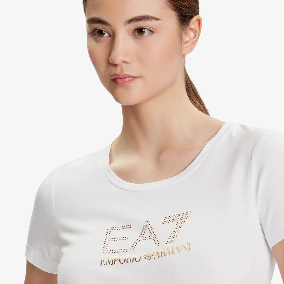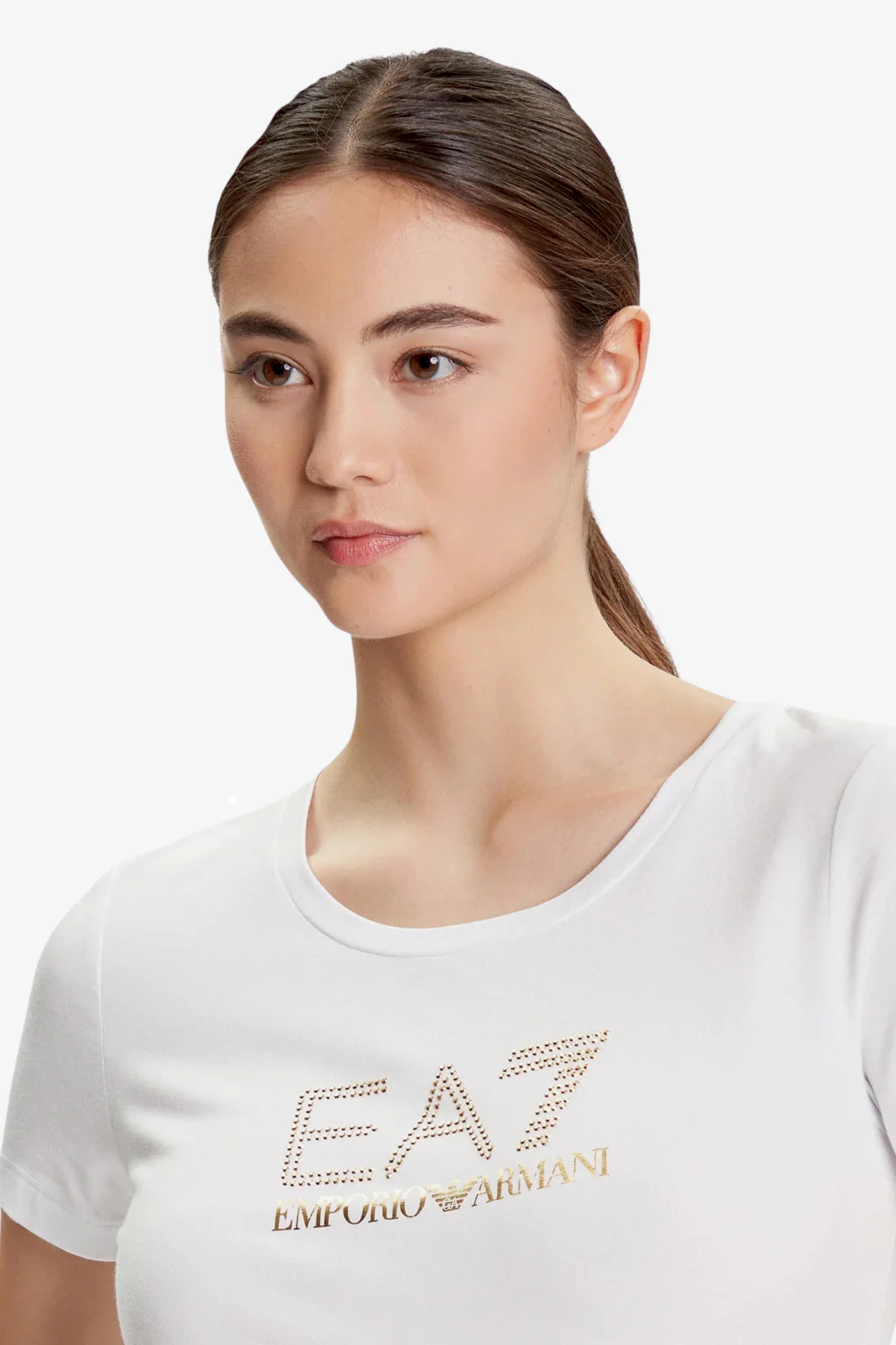 Questa t-shirt EA7 in cotone leggermente elasticizzato è pensata per completare il tuo look sporty con un tocco luminoso. Perfetta da abbinare ai pantaloni e alle felpe di collezione per un total look confortevole e di tendenza, ideale per i tuoi allenamenti o per i momenti di relax.