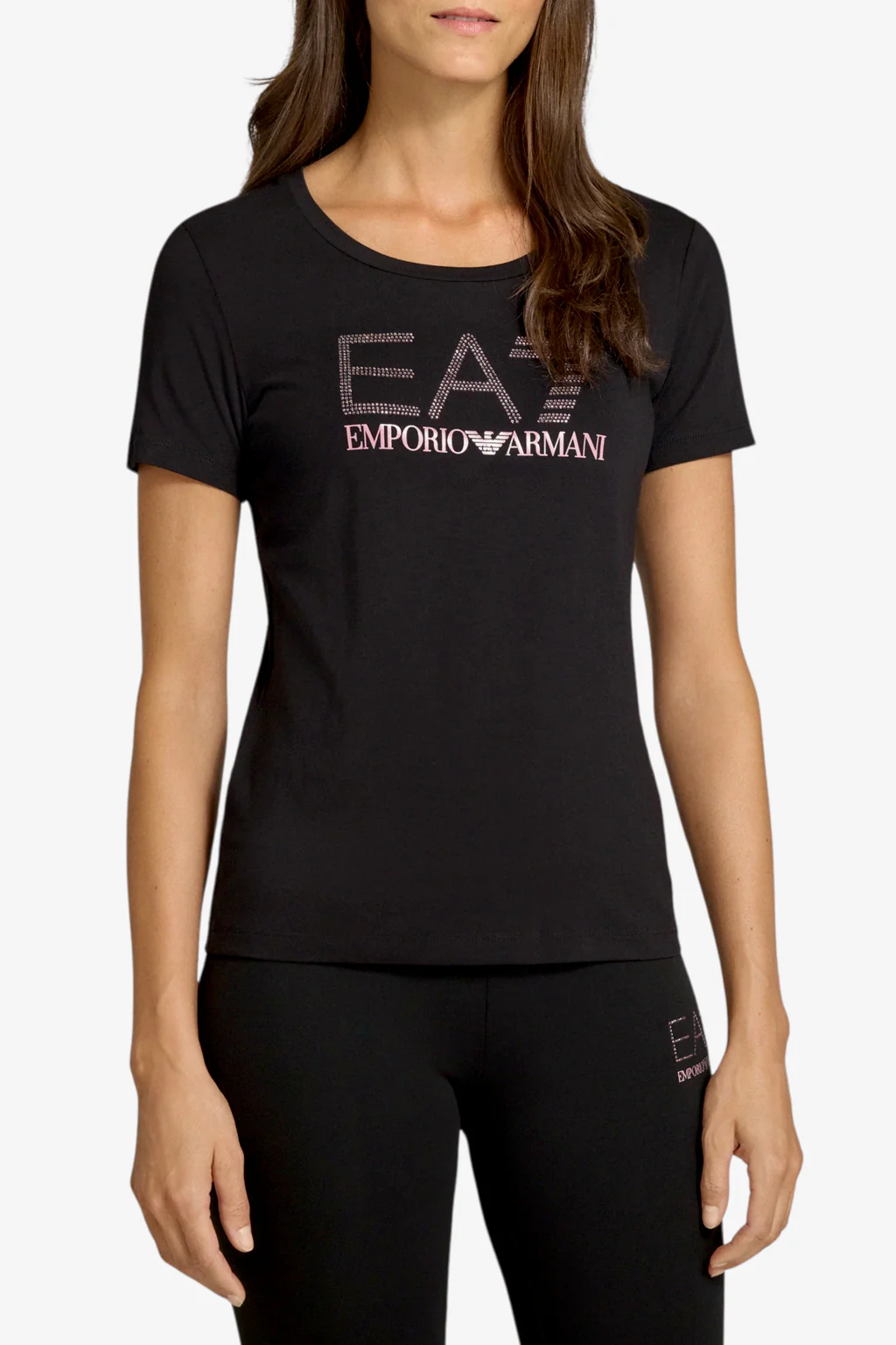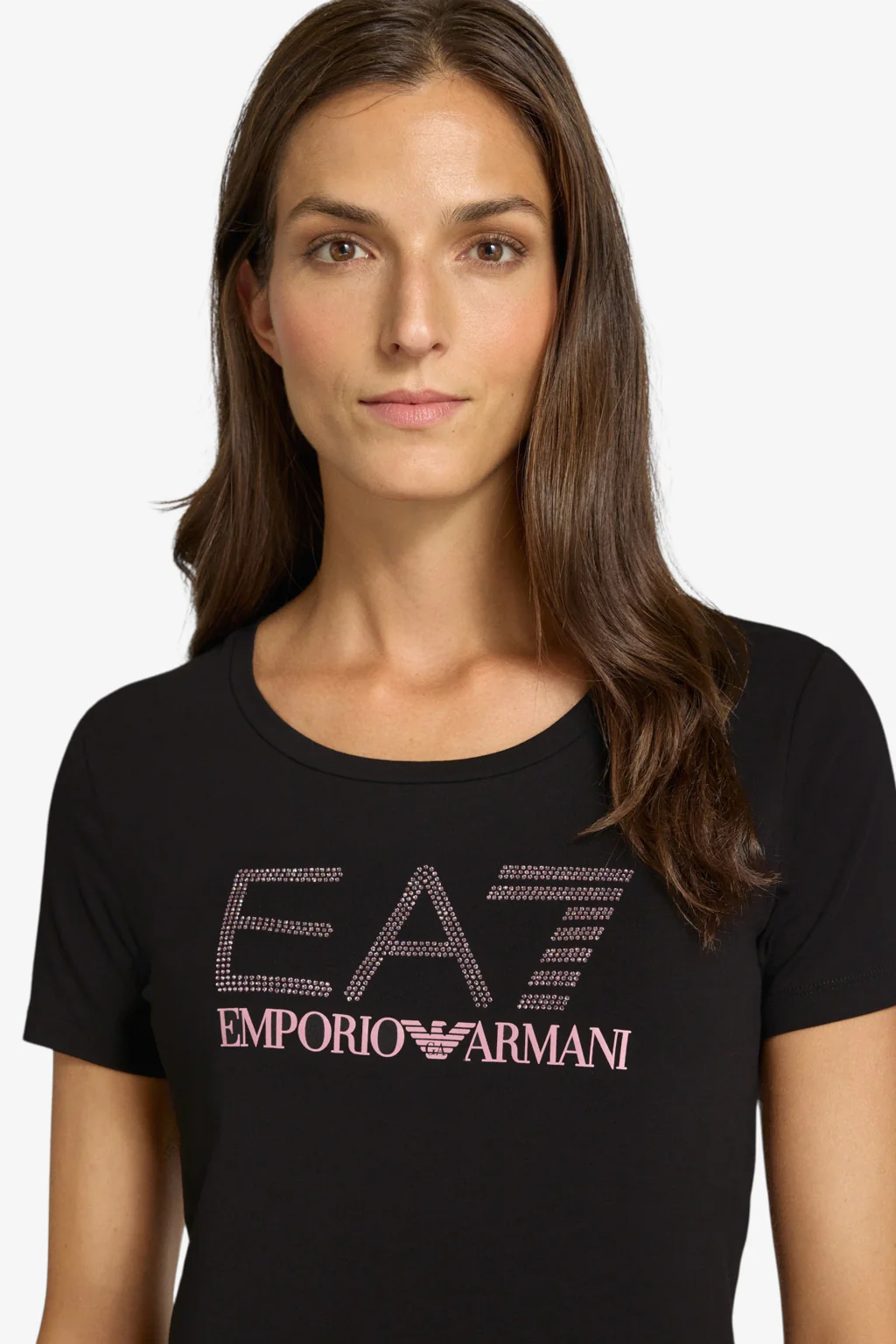 T-shirt Emporio Armani EA7 da donna T-shirt girocollo a manica corta realizzata in cotone stretch. Il modello è impreziosito dal maxi logo frontale realizzato in strass che creano numerosi punti luce ed elevano il capo. Caratteristiche della t-shirt: Scollo tondo Maxi logo frontale con inserti in strass