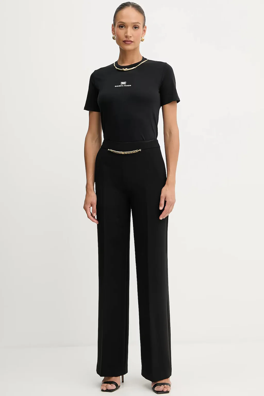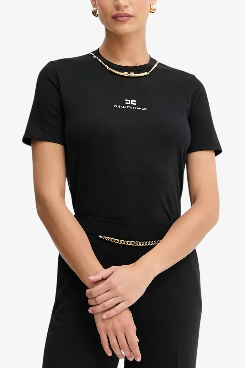 T-shirt Elisabetta Franchi da donna T-shirt a maniche corte in jersey di cotone. È impreziosita dalla collana amovibile con catena, logo centrale ed elementi tubolari in metallo dorato. Il logo a rilievo regala un’ultima nota di luce. Caratteristiche della t-shirt: Accessorio in metallo dorato Dettaglio con logo Vestibilità regular