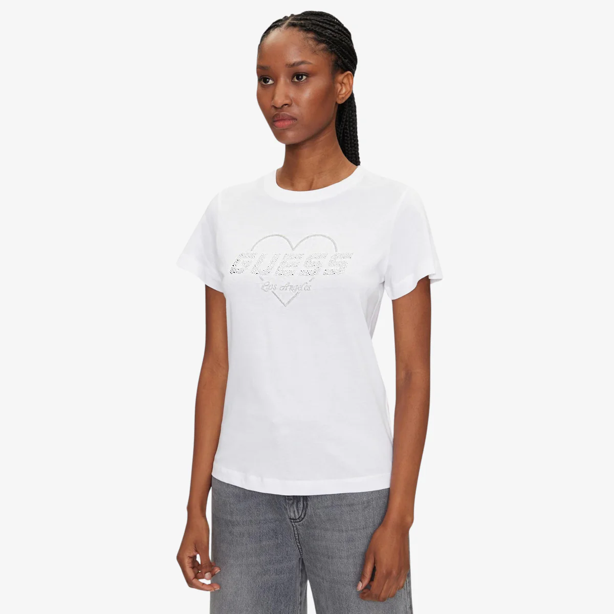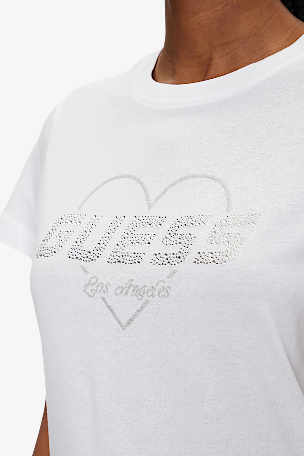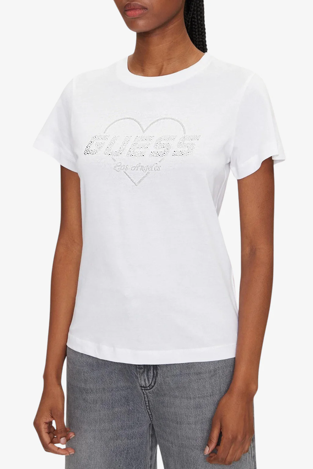 T-shirt Guess da donna Caratteristiche della t-shirt: Taglio leggermente corto Maniche corte Girocollo Logo strass applicato sul fronte della t-shirt Grafica frontale con cuore e scritte