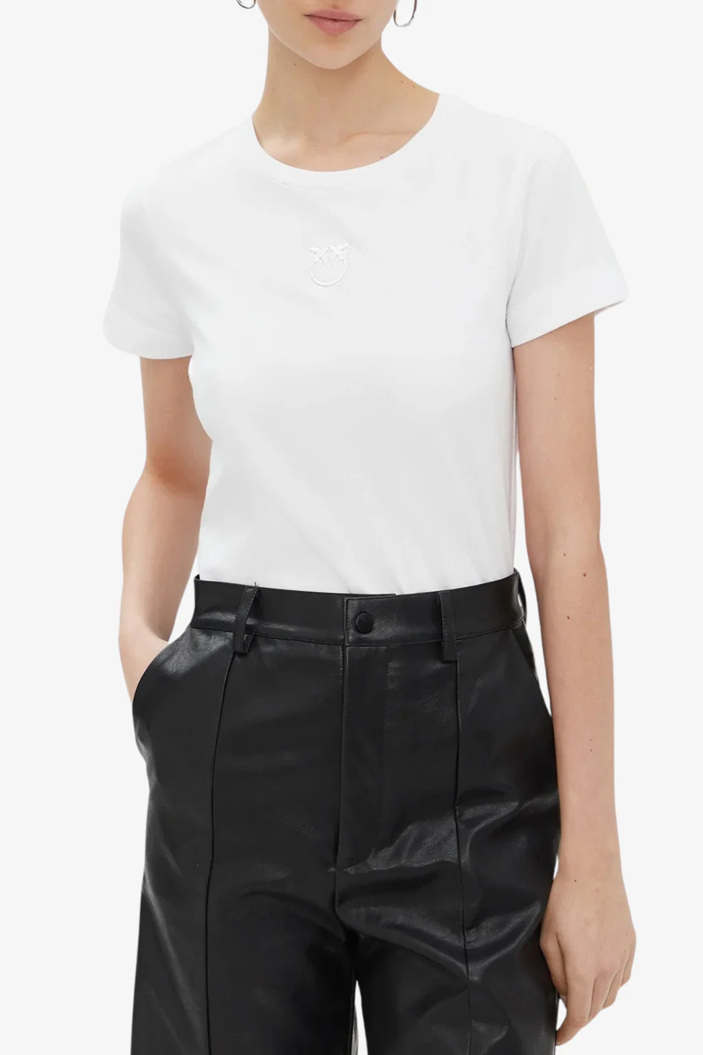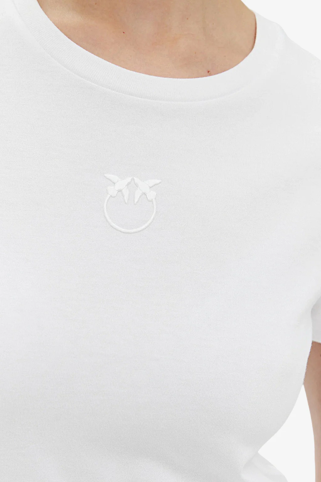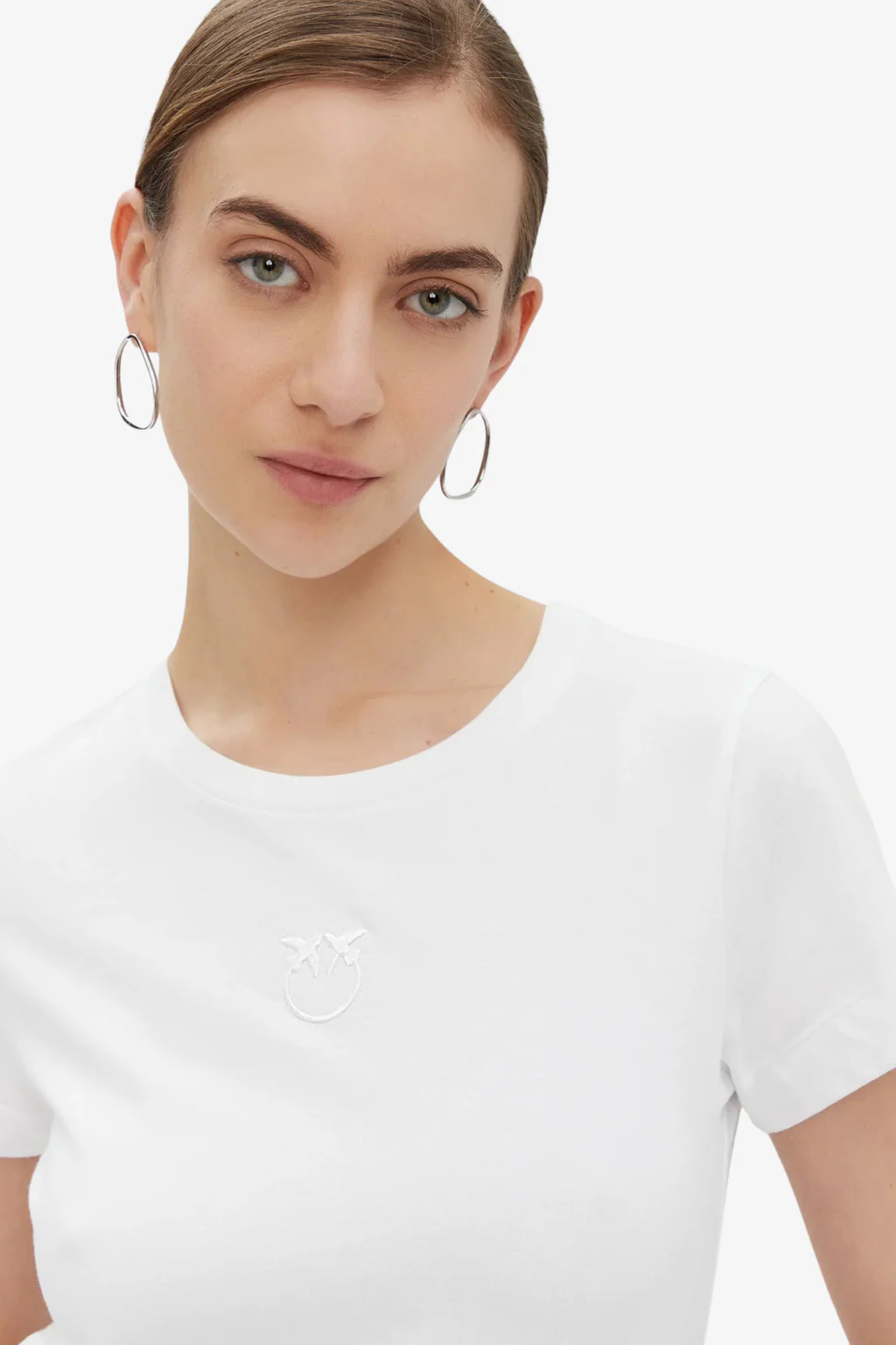 T-shirt da donna a maniche corte in jersey di cotone effetto old wash con logo Love Birds effetto ricamato davanti. Questa t-shirt rappresenta un vero e proprio passepartout in puro stile PINKO: perfetta da indossare in qualunque occasione, dalle più formali alle più sporty, aggiungendo un tocco femminile e iconico.