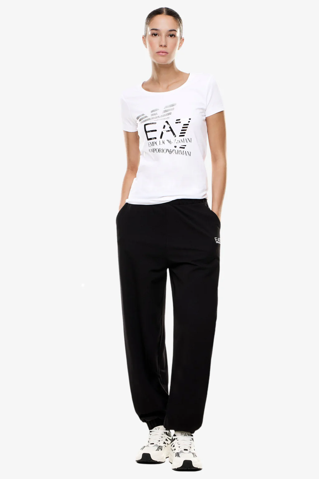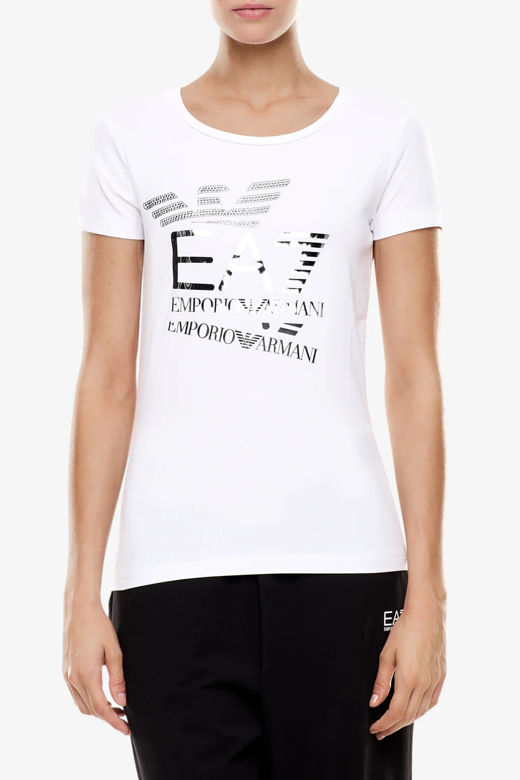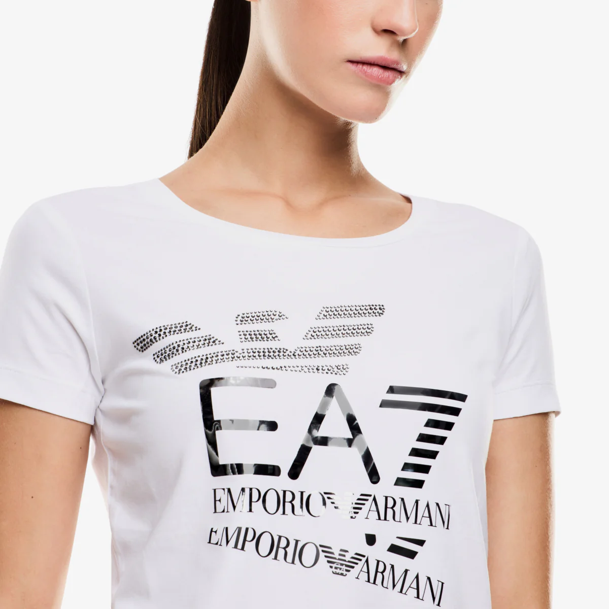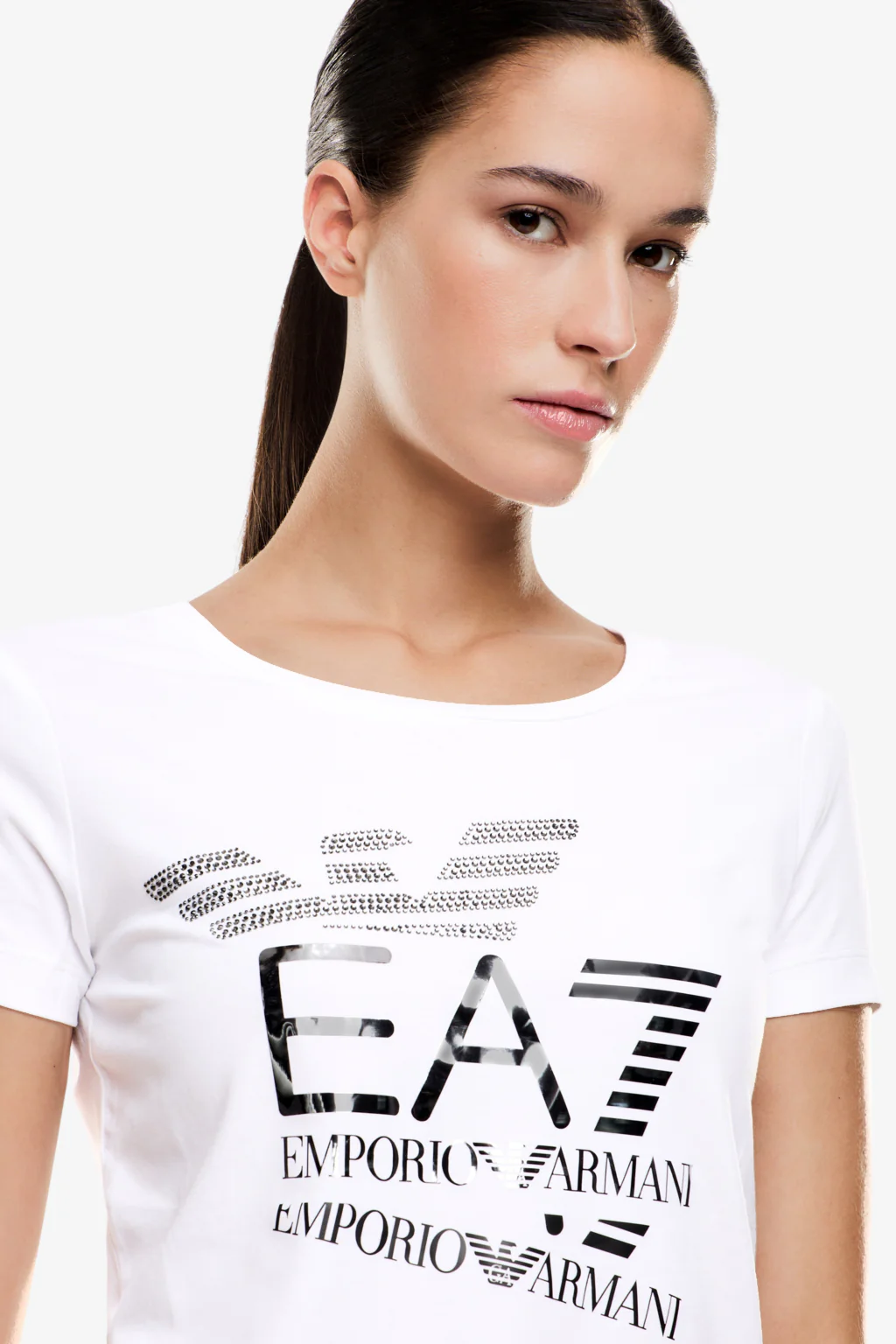 T-shirt girocollo a manica corta dal design essenziale e pulito, realizzata in cotone stretch. Il modello è impreziosito dalla stampa frontale con mix di loghi a contrasto, illuminato dal logo Eagle realizzato in strass e dal logo EA7 effetto metallizzato.