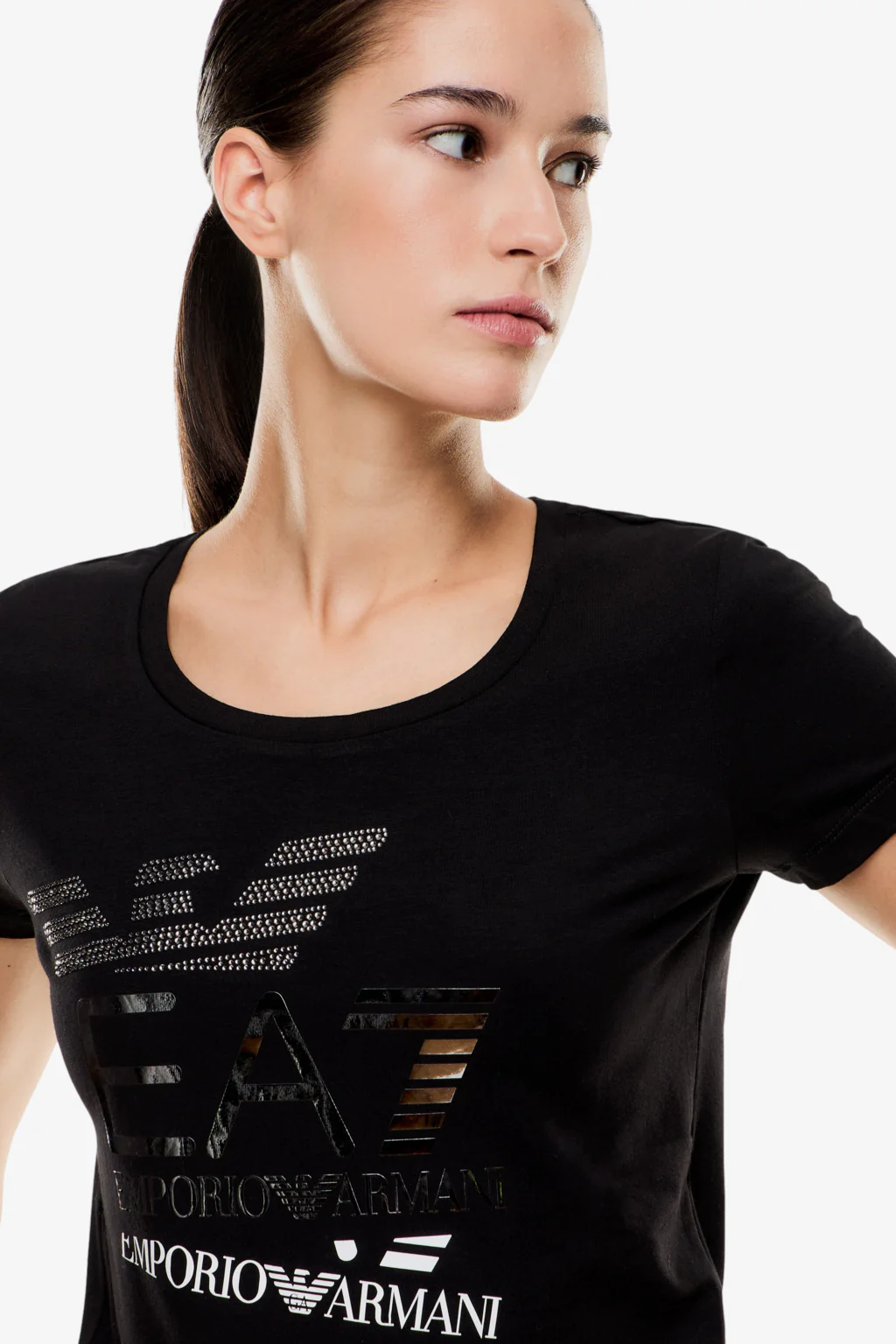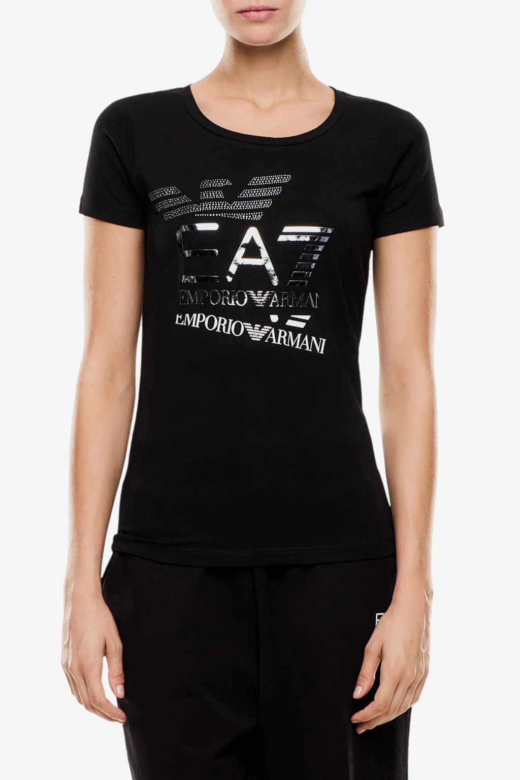 T-shirt girocollo a manica corta dal design essenziale e pulito, realizzata in cotone stretch. Il modello è impreziosito dalla stampa frontale con mix di loghi a contrasto, illuminato dal logo Eagle realizzato in strass e dal logo EA7 effetto metallizzato.