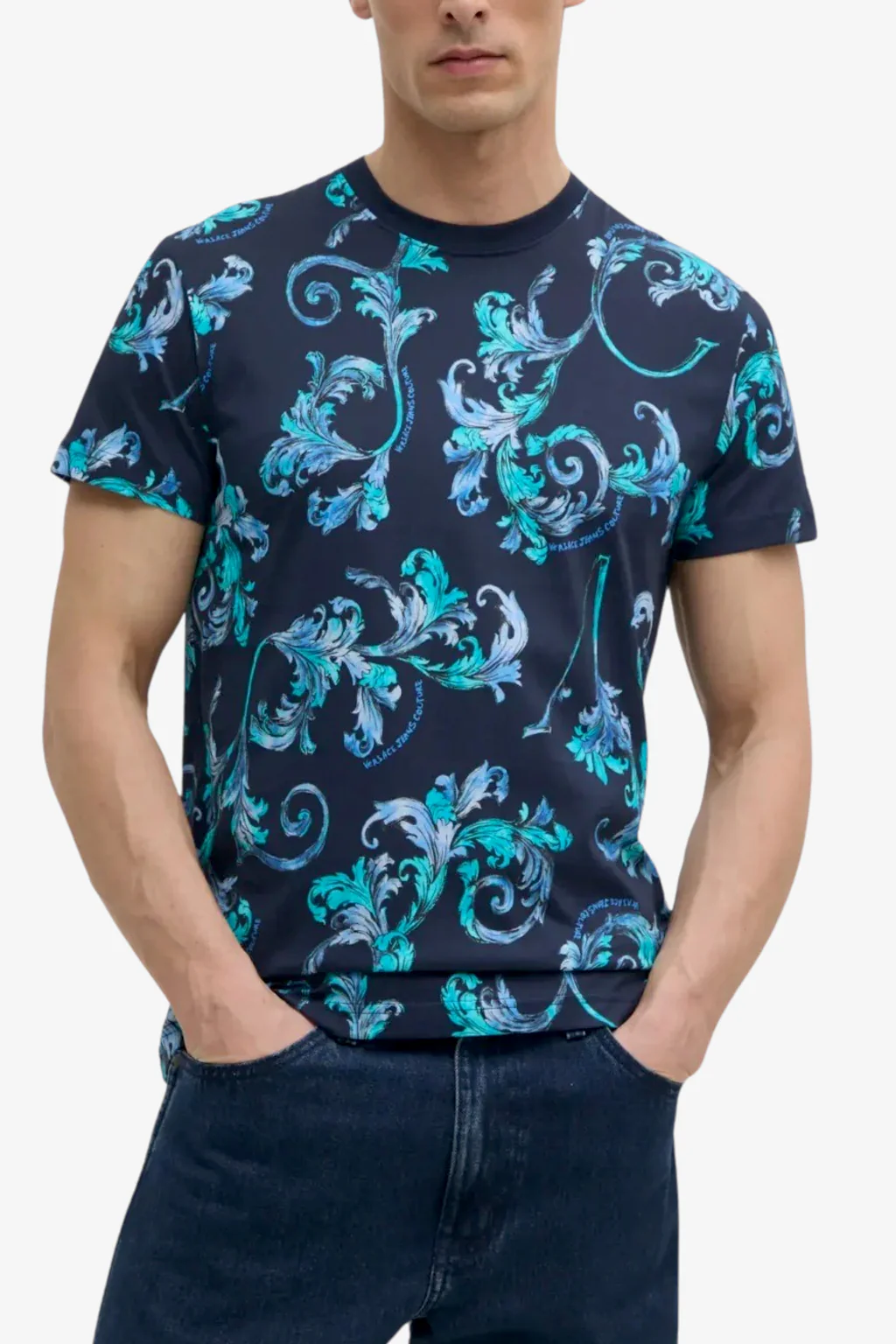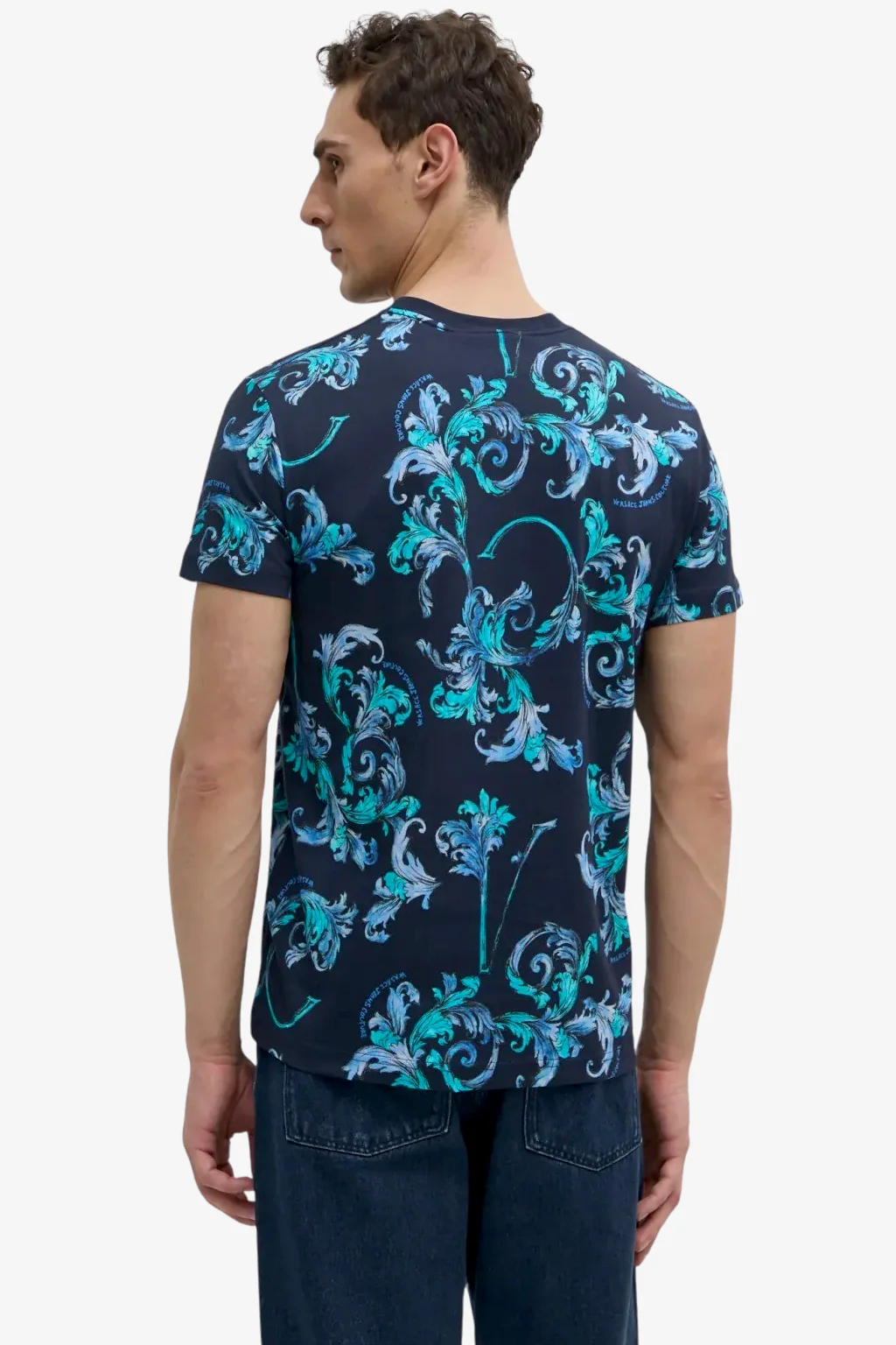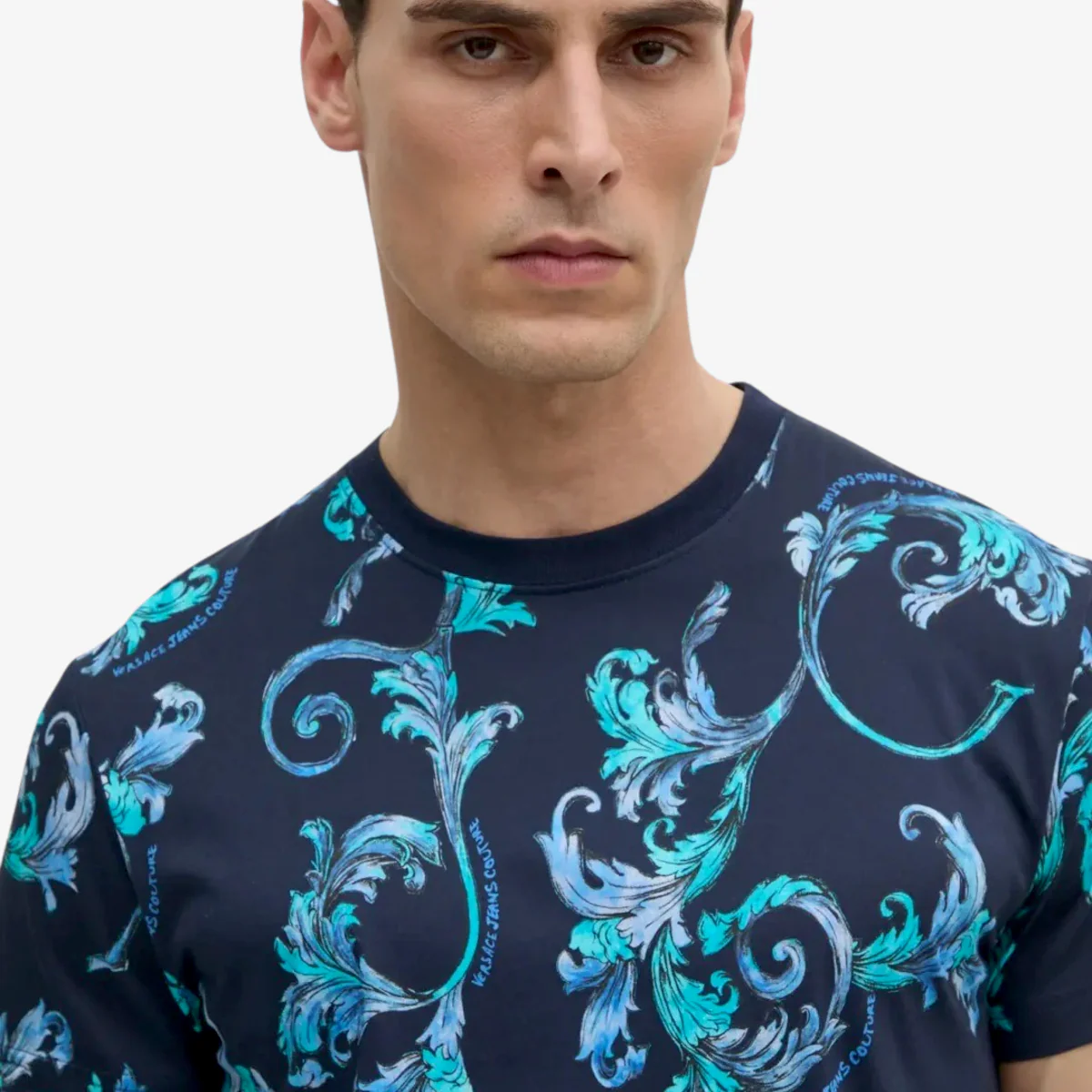 T-Shirt Versace Jeans Couture da uomo La T-shirt in jersey di cotone a maniche corte con vestibilità slim presenta una stampa Outline Barocco all-over. Caratteristiche della t-shirt Stampa Outline Barocco Maniche corte Girocollo