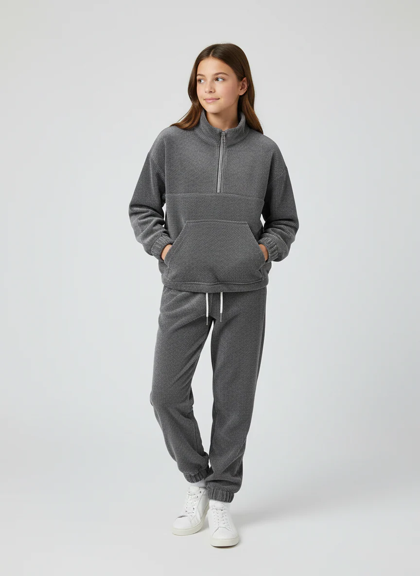 Tuta due pezzi per ragazza costituita da felpa e pantalone. Caldo tessuto a coste di grande comfort e morbidezza.