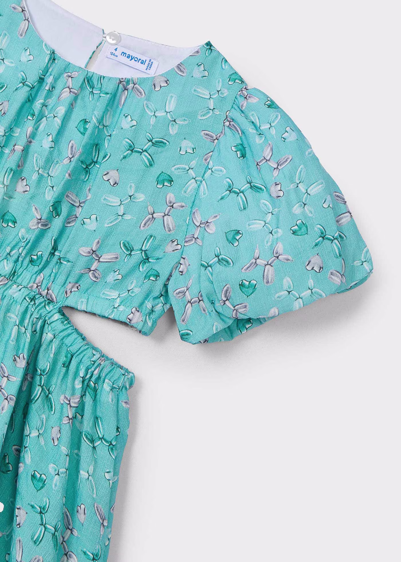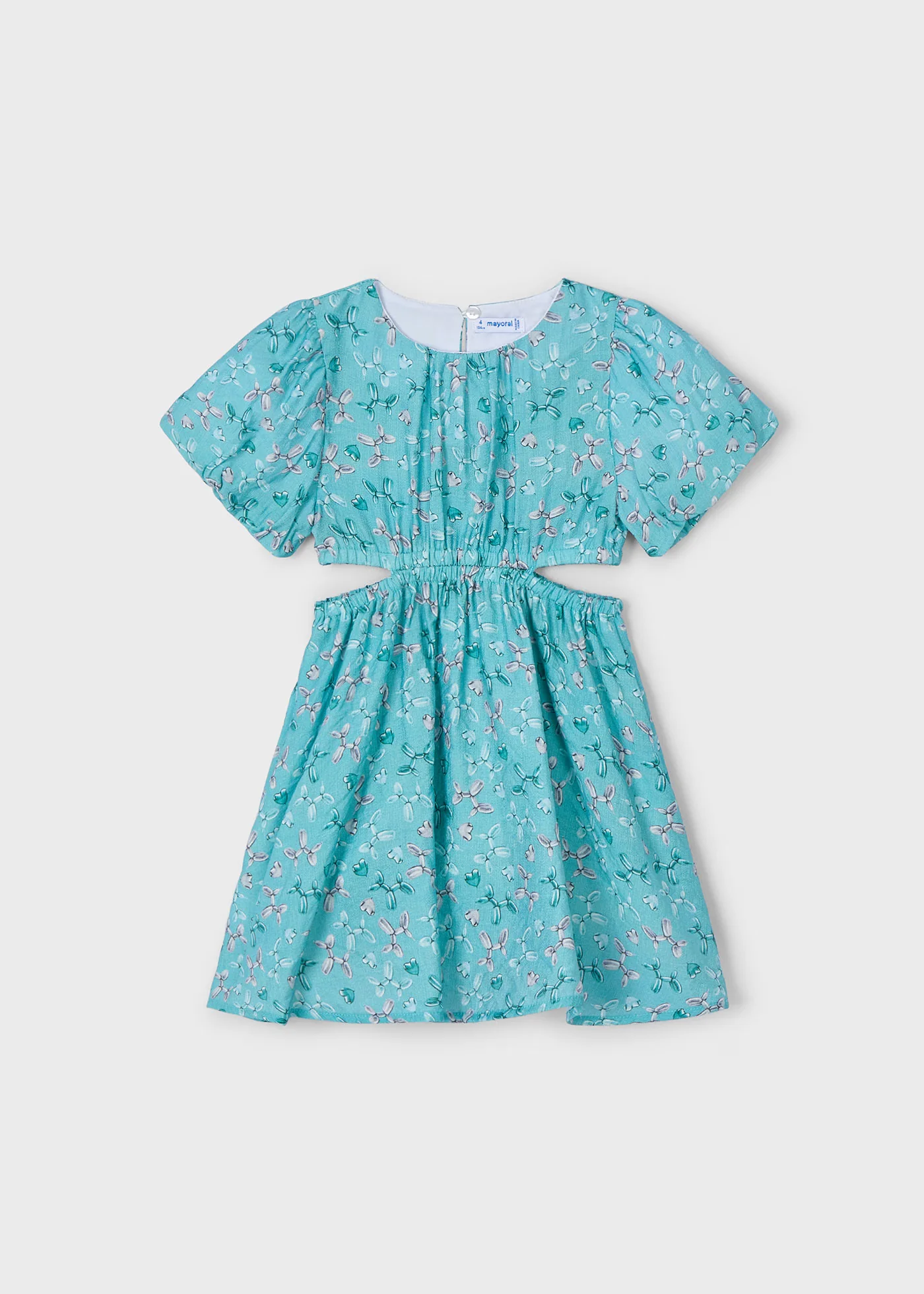 Vestito con maniche a palloncino per bambina. Girocollo. Chiusura con bottone sul colletto per facilitare la vestibilità. Modello con fodera interna. Parte anteriore arricciata. Elementi decorativi: apertura decorativa.