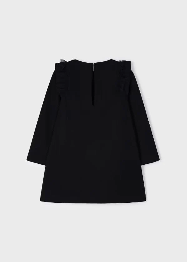 Vestito manica lunga per bambina con volant sulle spalle. Girocollo. Piccola apertura sulla schiena con chiusura con bottone per facilitare la vestibilità del capo. Tasche funzionali nella parte anteriore.
