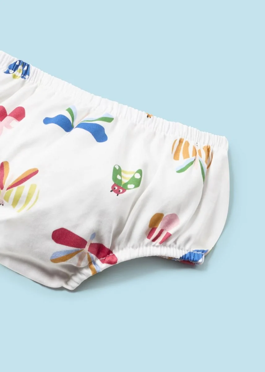 Completo due pezzi per neonata costituito da un delizioso vestito con culotte abbinata. Vestito giromanica per neonata. Girocollo. Chiusura con bottoni a pressione nella parte posteriore che facilitano la vestibilità del capo. Design stampato. Shorts modello culotte esclusivo per la nostra collezione neonato. Composizione: 100% Cotone Stagione: Primavera-Estate
