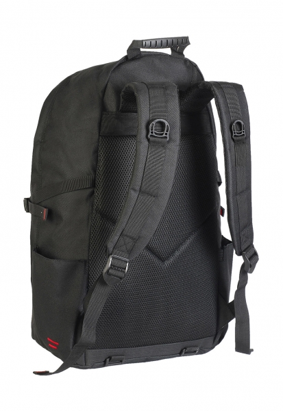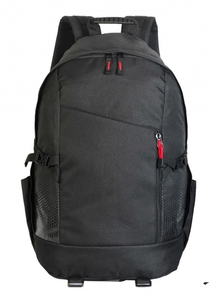Zaino con manico per il trasporto, bretelle imbottite regolabili, cinghie di compressione, scomparto principale con cerniera e uno più piccolo nella parte anteriore, due ampie tasche laterali. Capacità: 35 Lt. Dimensione: 30 x 54 x 22 cm.