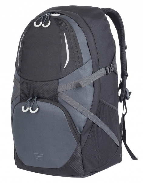 Zaino da trekking o per tutti i giorni con maniglia per il trasporto, bretelle imbottite regolabili con cinghia pettorale, cinghie di compressione sui lati, scomparto principale con apertura vano con cerniera. Tasca frontale con cerniera e tasche laterali in rete. Dettagli riflettenti. Colore: Nero-Grigio. Capacità: 50 litri. Dimensioni: 54 x 36 x 26 cm.