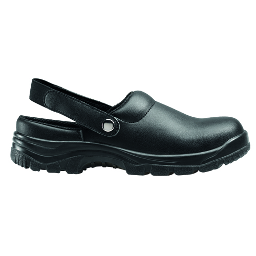 Zoccolo nero impermeabile antinfortunistico, con puntale rinforzato in materiale composito. Aperto sul tallone e con fibbia elastica per una maggiore adesione stabilità del piede. Suola antiscivolo, antistatica e rinforzata.